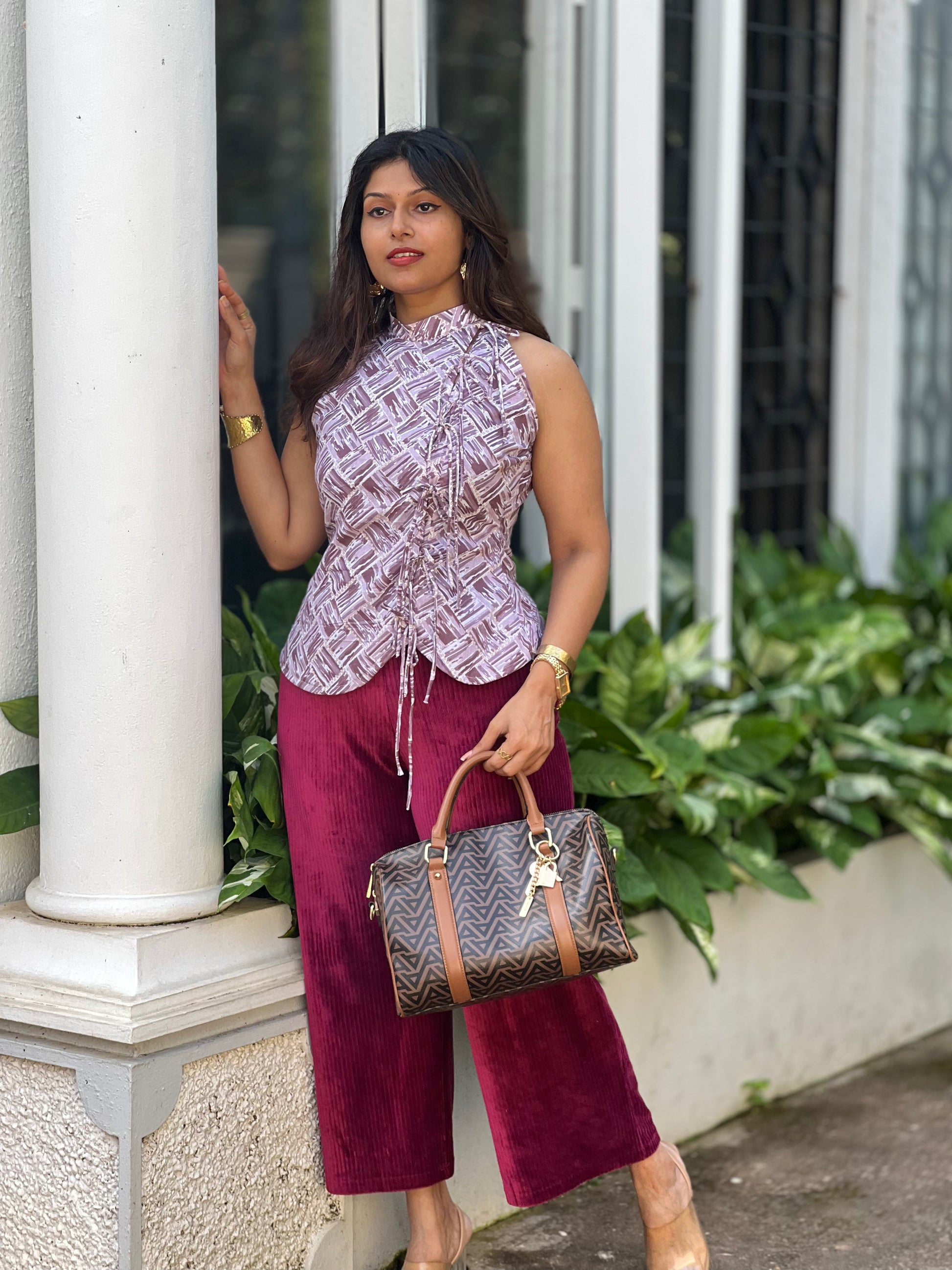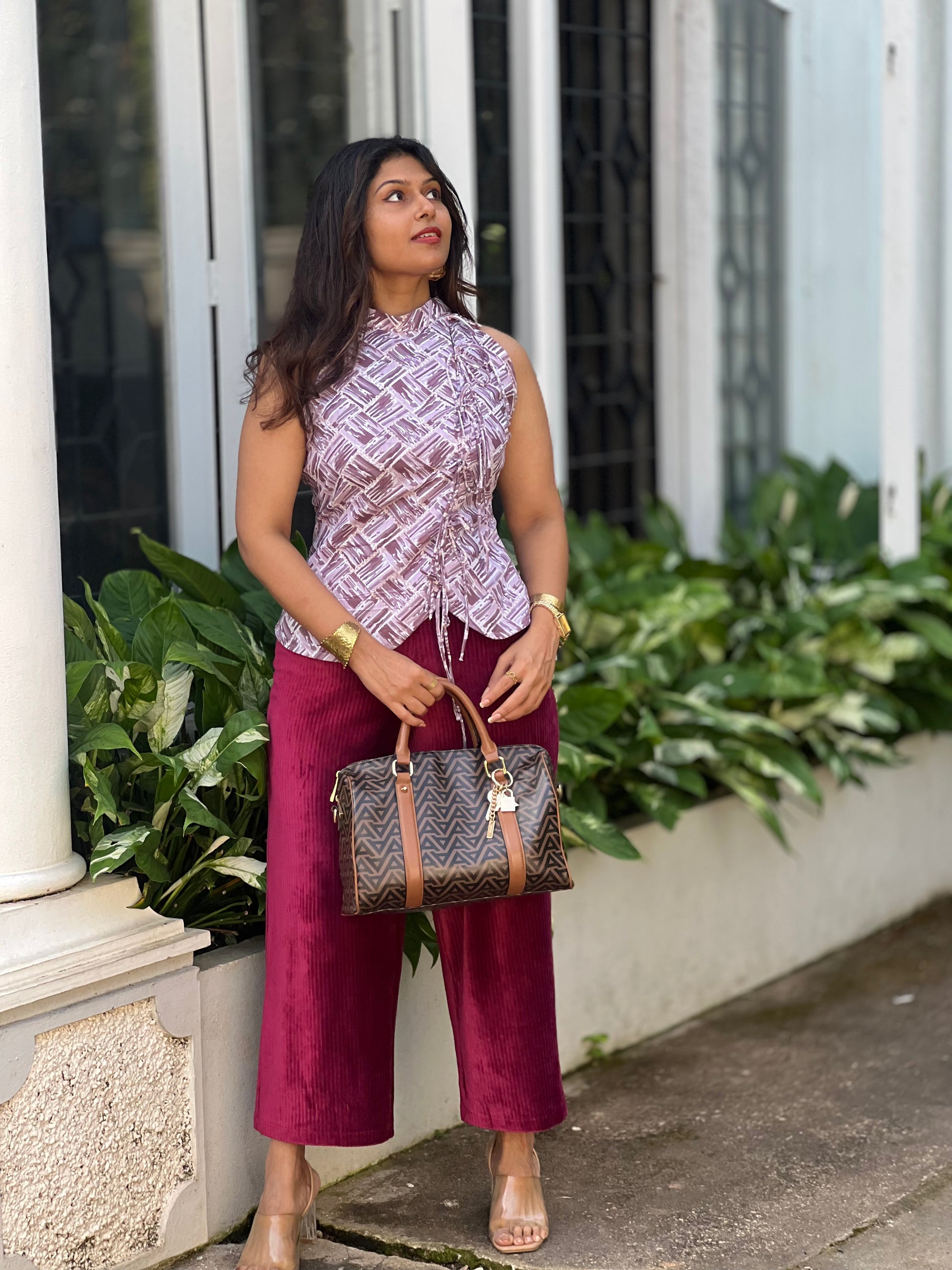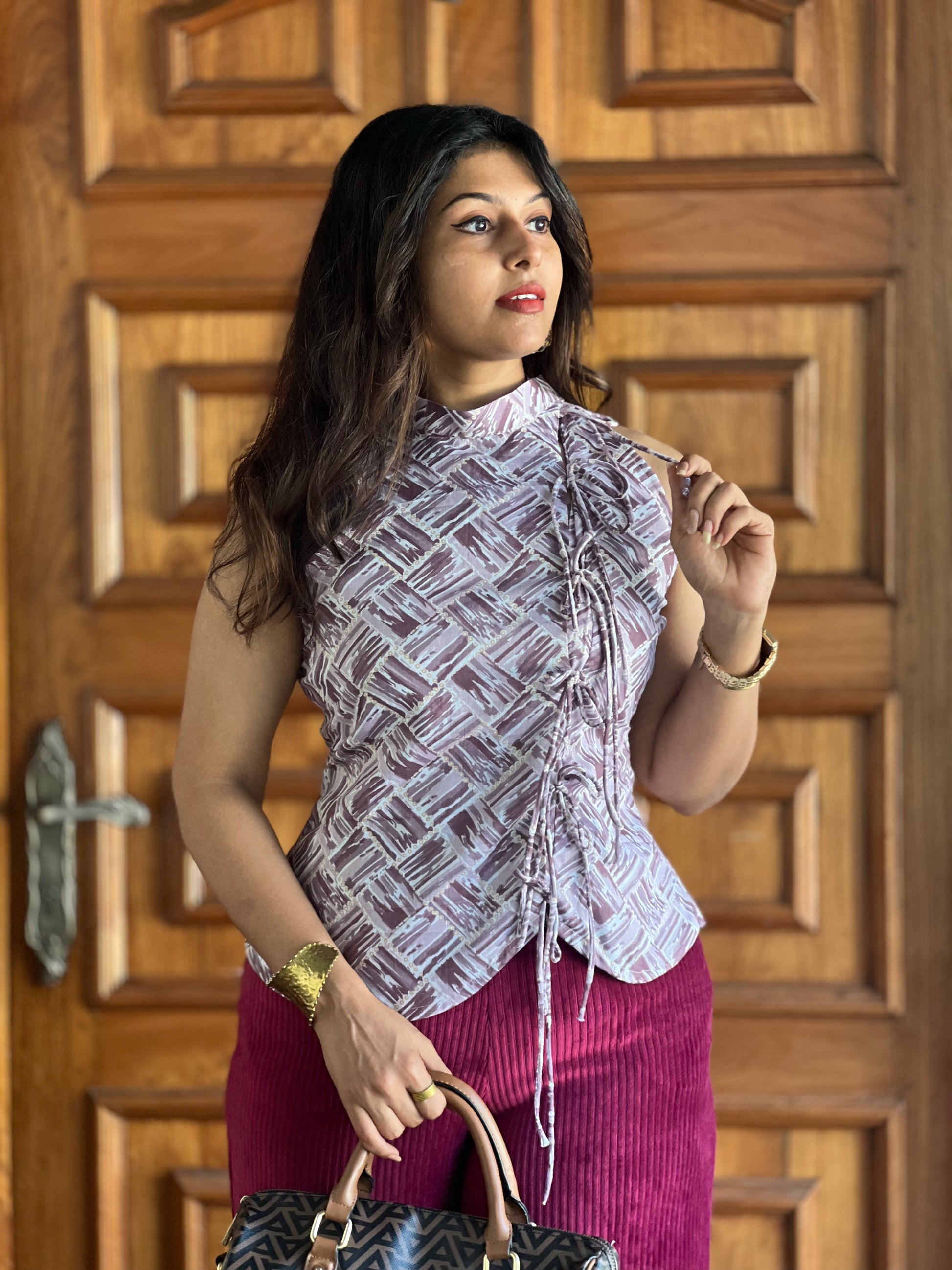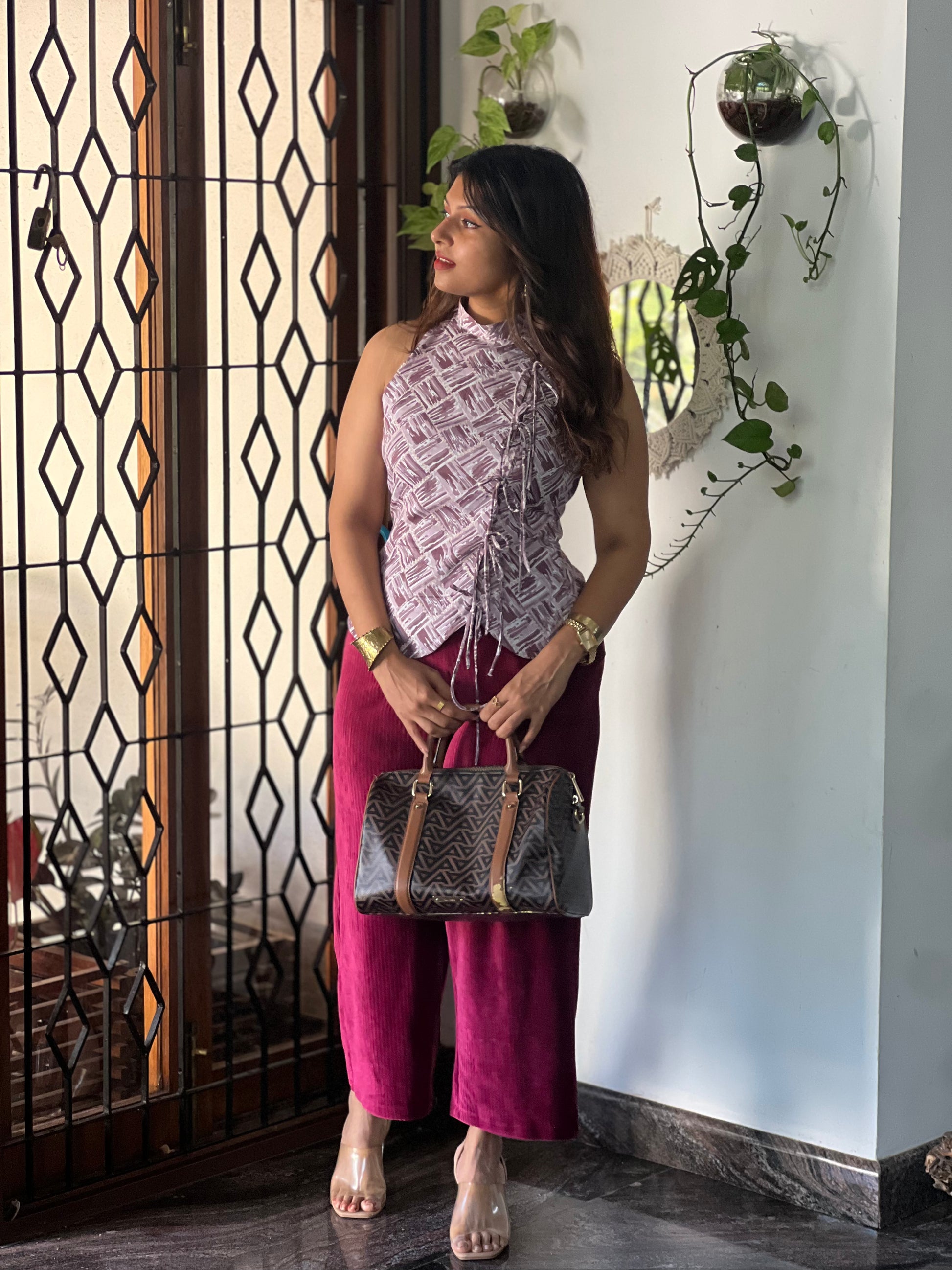 Keep the look minimal with high‑waisted trousers or a midi skirt, letting the halter neckline and side tie shine.