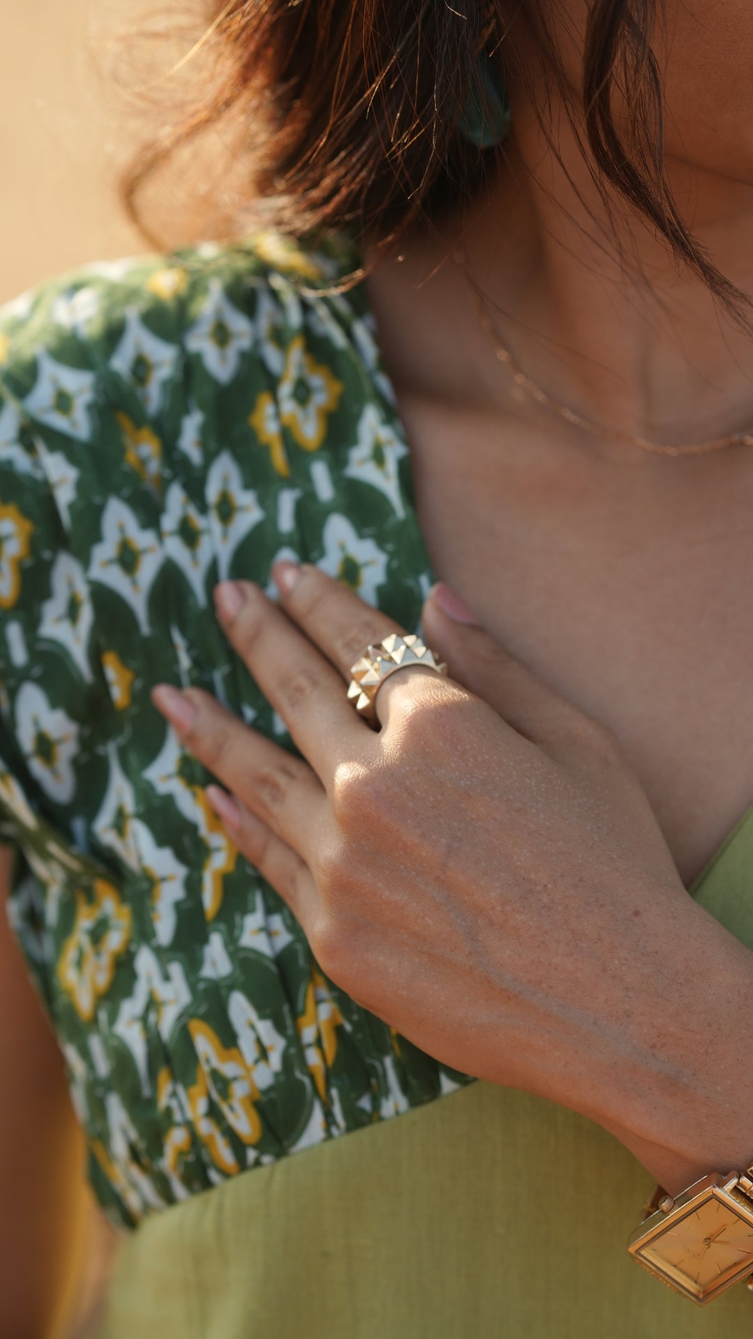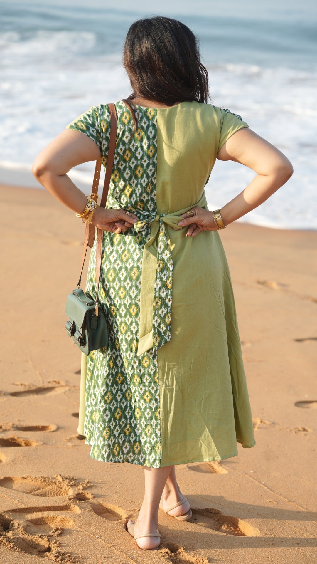 Pair Fidaa with minimal sandals for a relaxed daytime look or elevate it with statement accessories for a more polished outfit. The earthy green tones and print combination make it ideal for both casual outings and vacation wear.