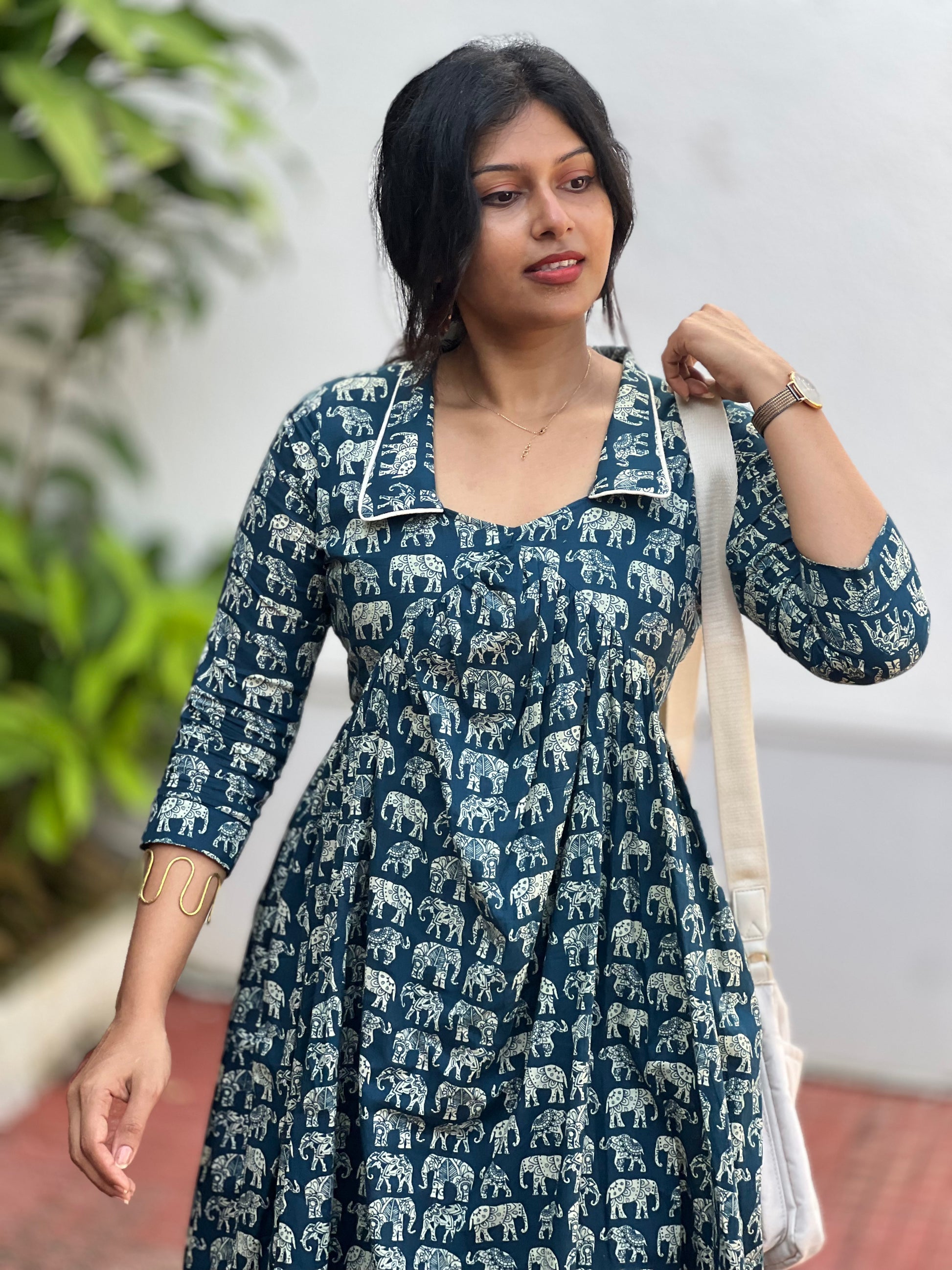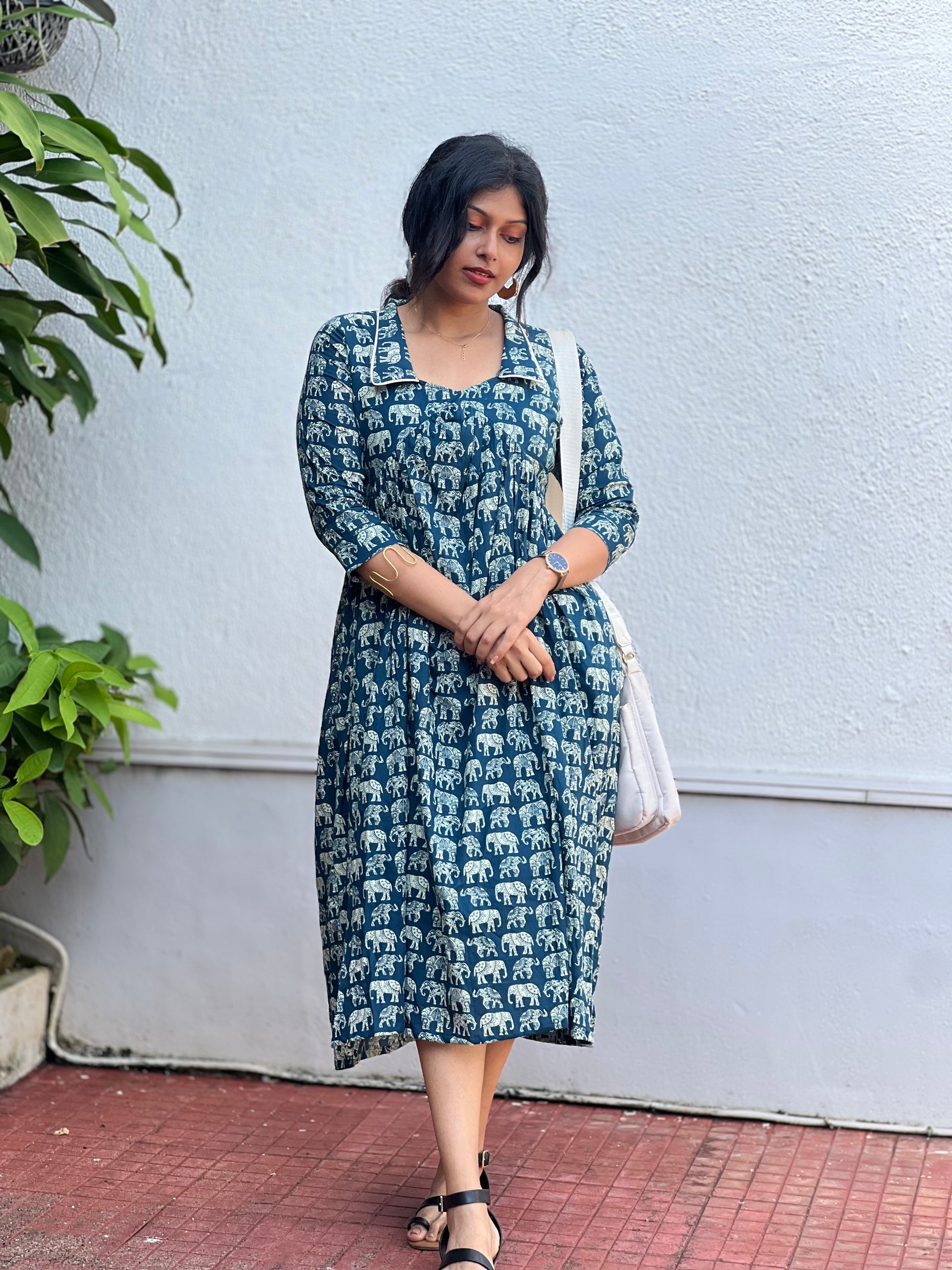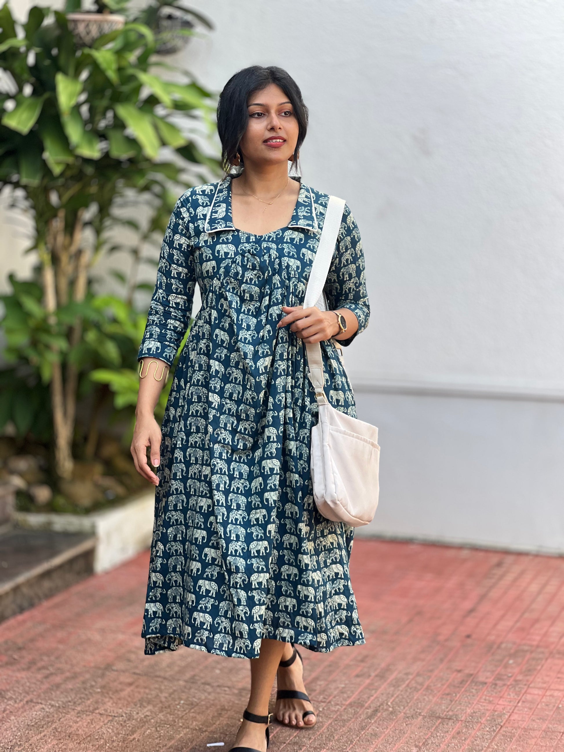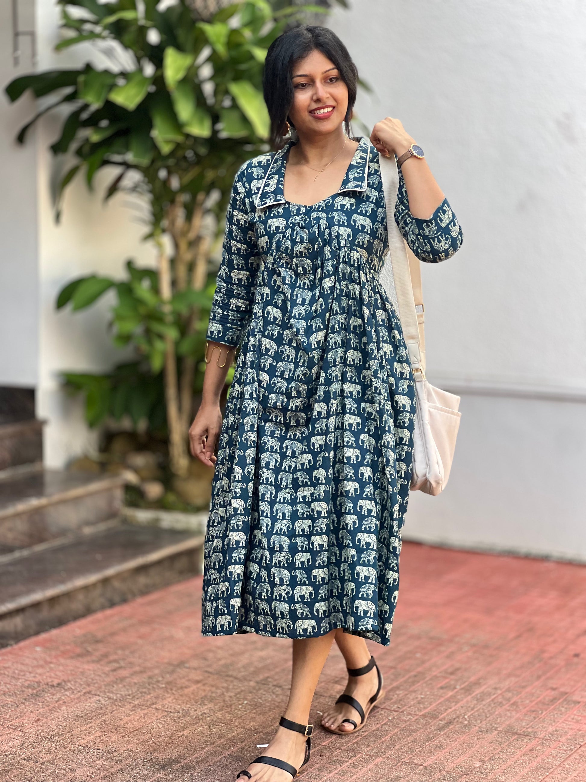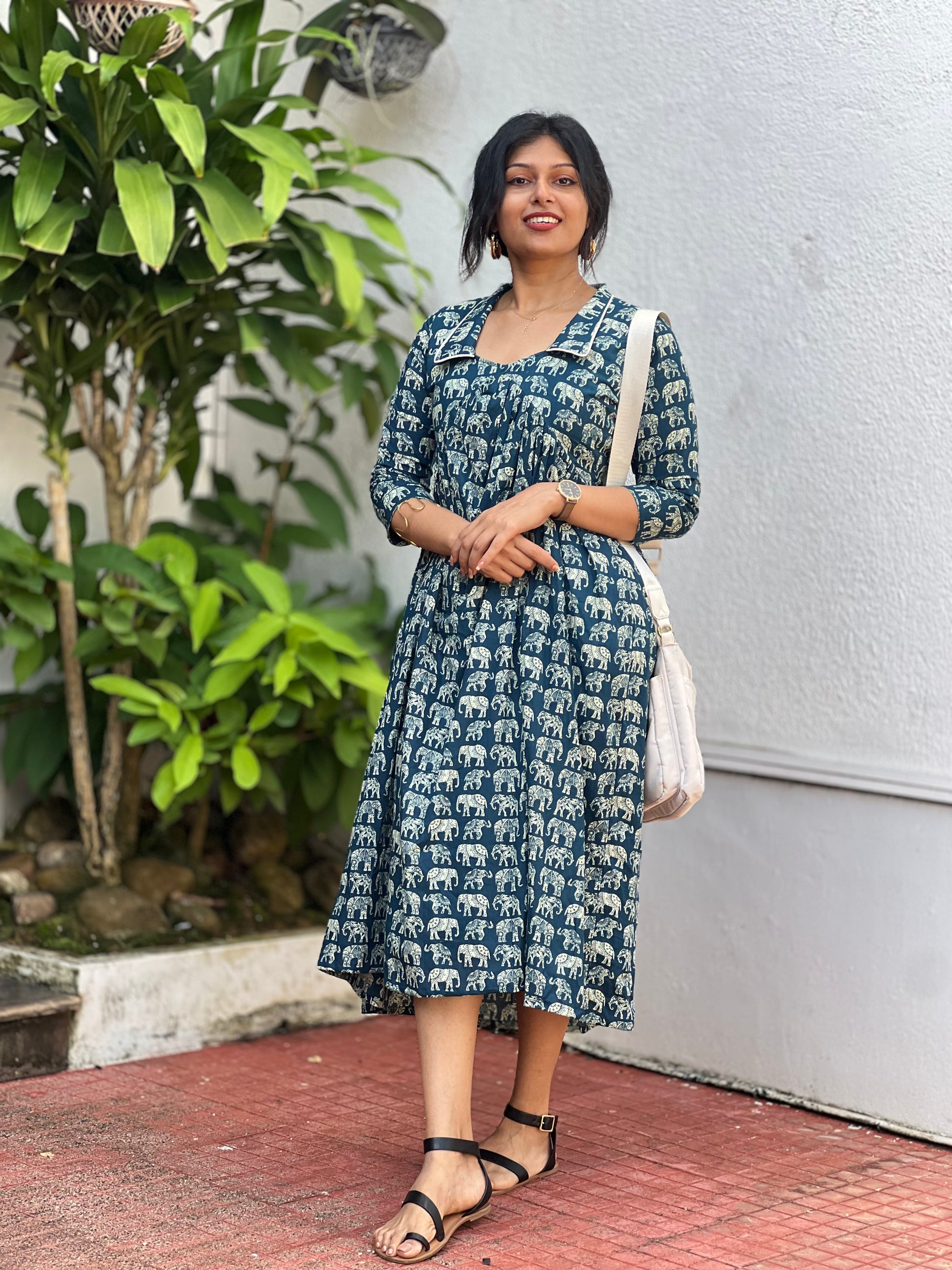 Enter a realm of customs and classic style wearing this gorgeous cotton dress with an Indian elephant print! This masterpiece, made from airy, pure cotton, combines comfort with culture, making it appropriate for every season. The flowing, dreamlike silhouette and the elaborate elephant motifs stand for strength, knowledge, and tradition!