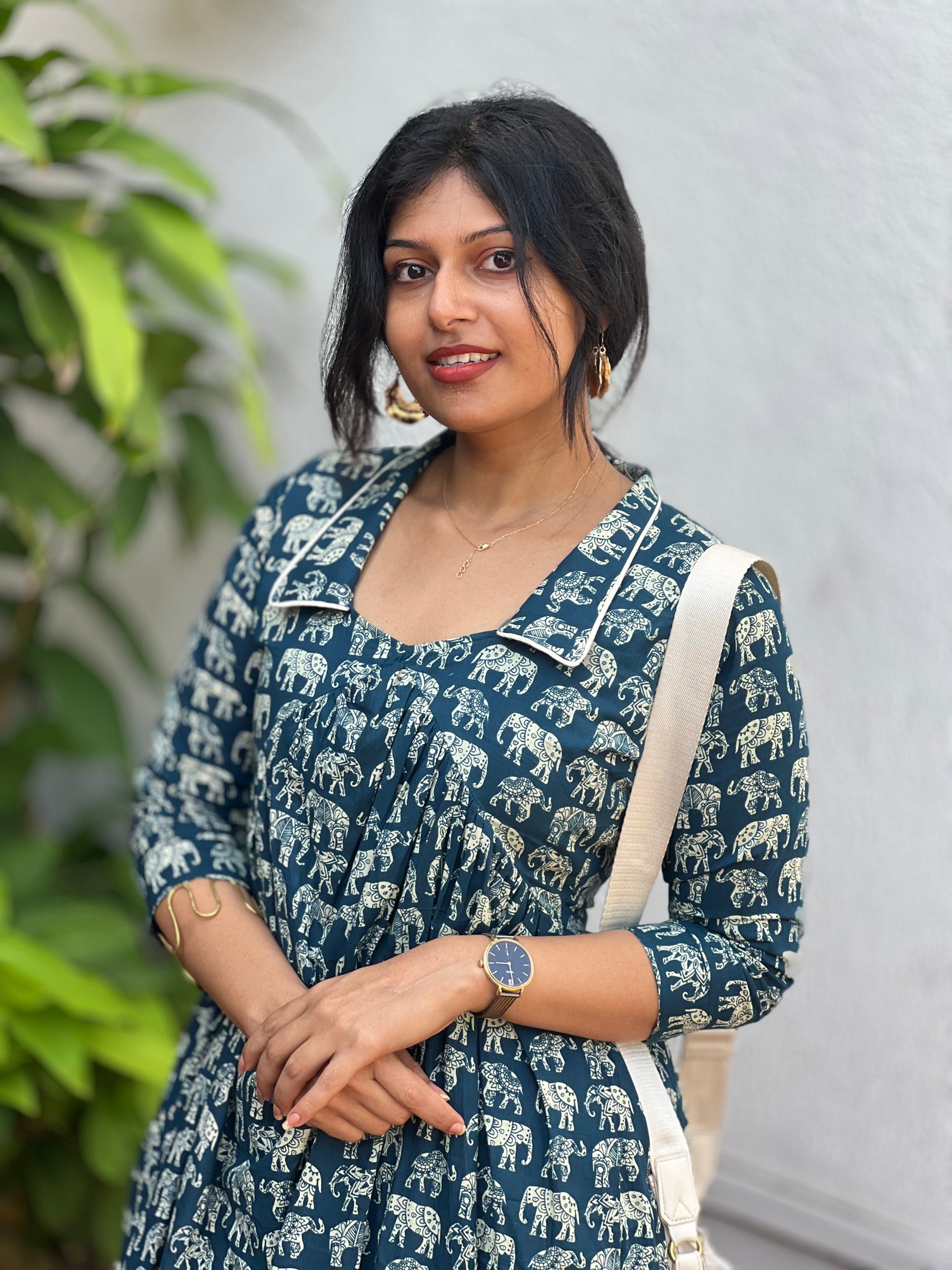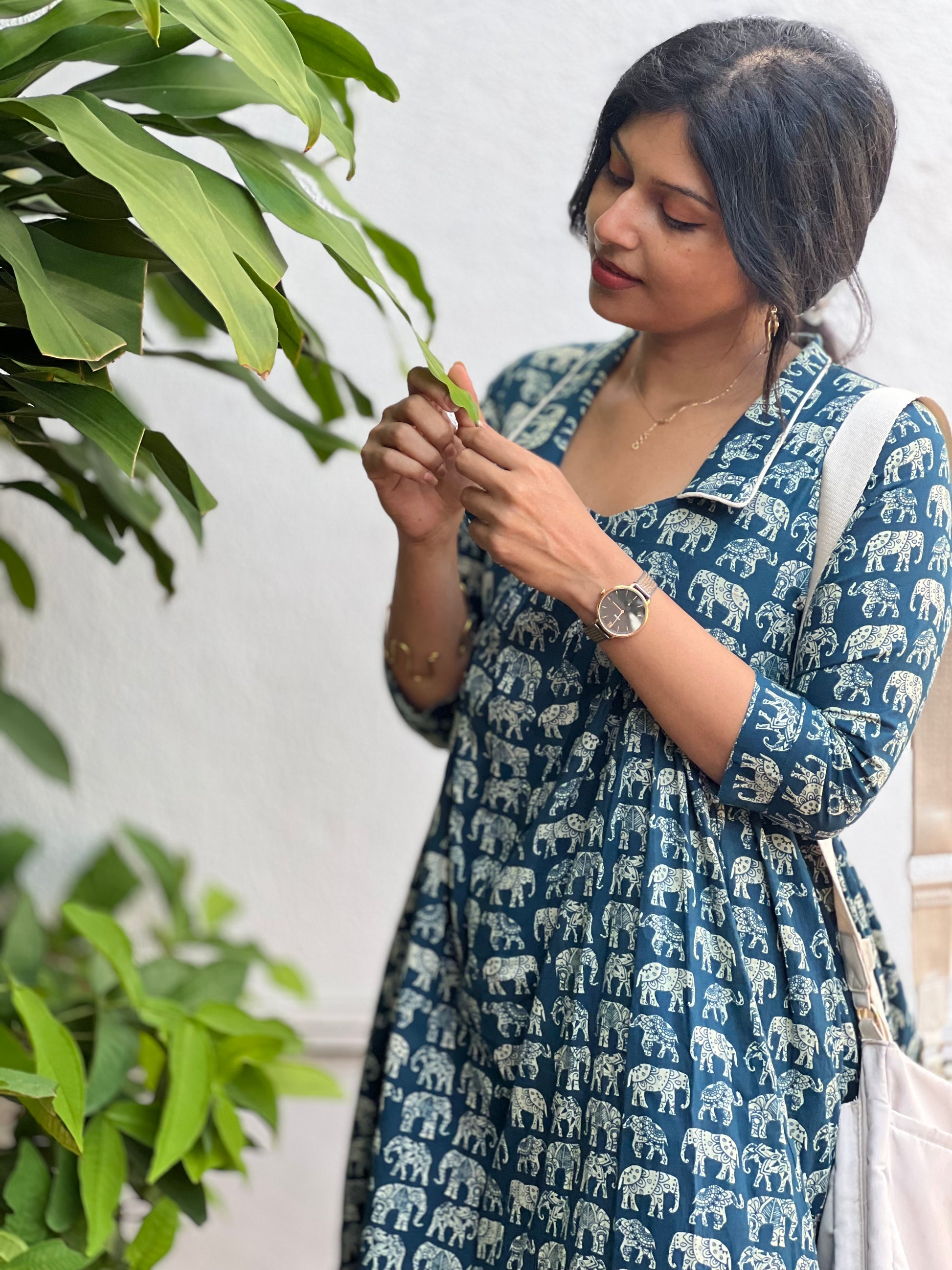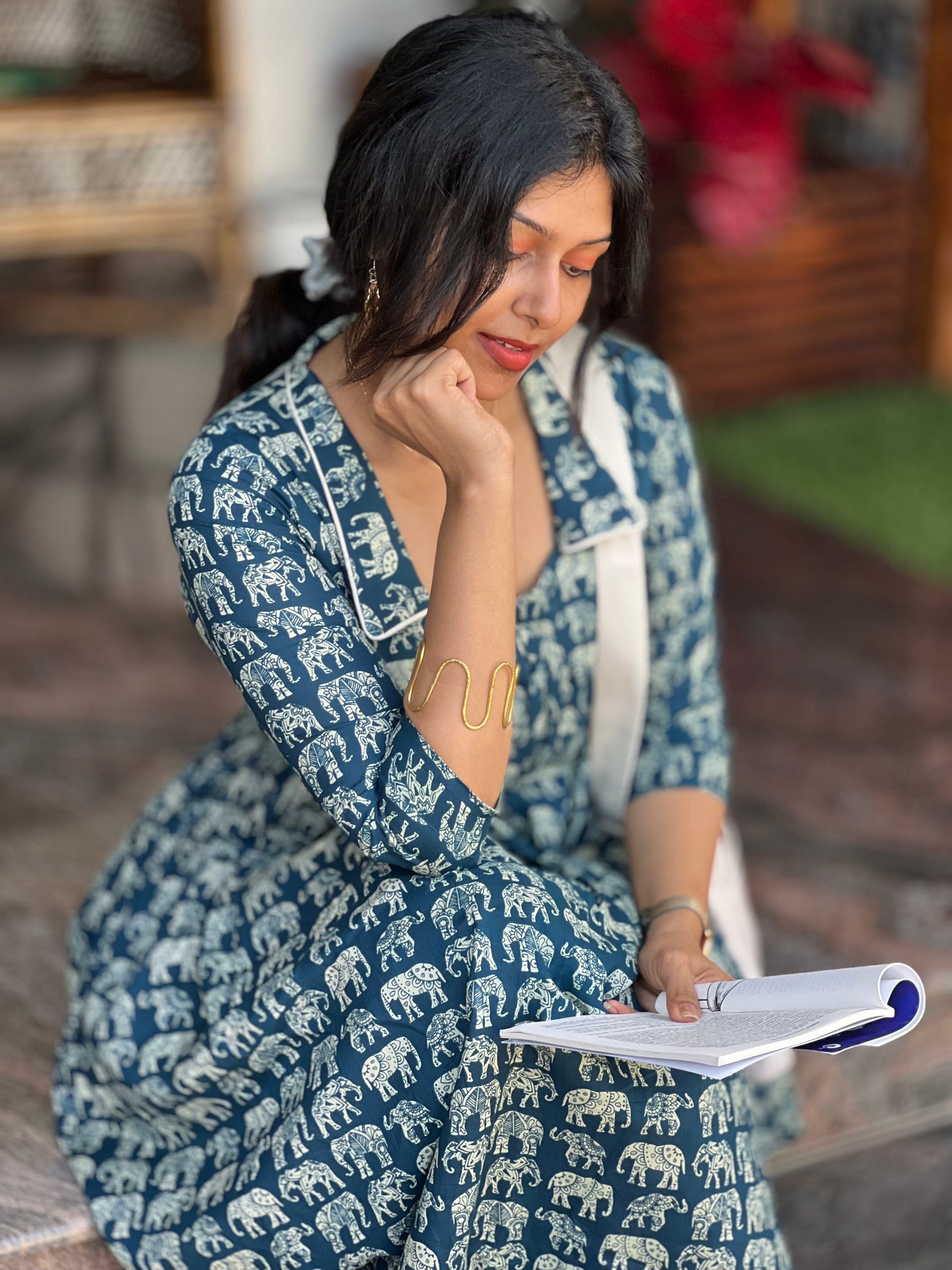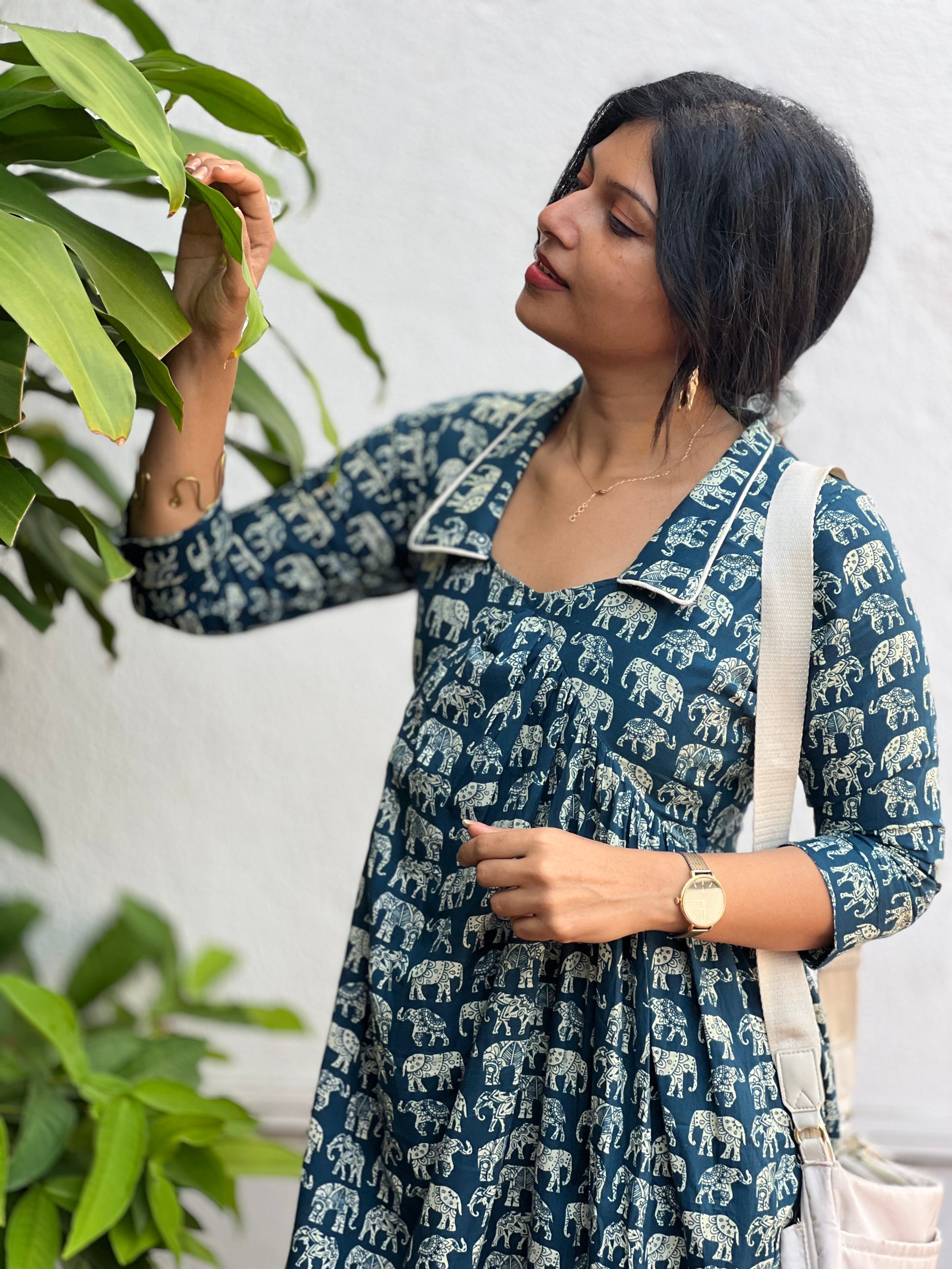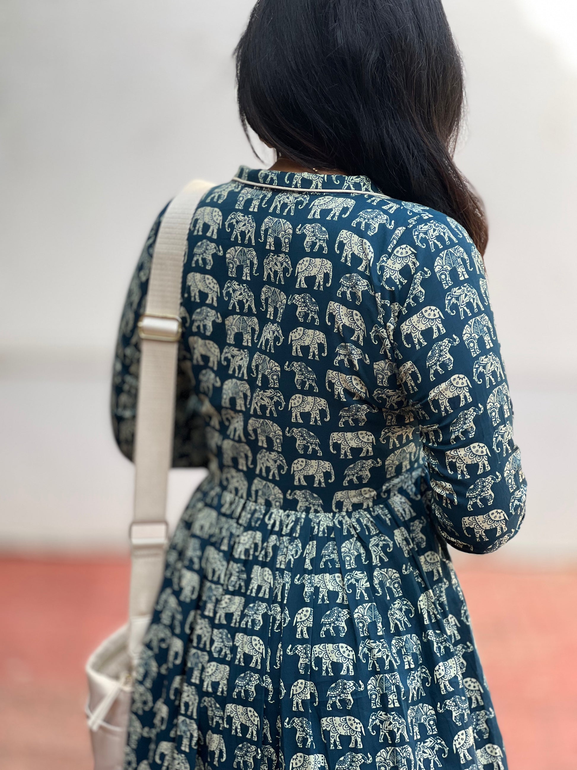Enter a realm of customs and classic style wearing this gorgeous cotton dress with an Indian elephant print! This masterpiece, made from airy, pure cotton, combines comfort with culture, making it appropriate for every season. The flowing, dreamlike silhouette and the elaborate elephant motifs stand for strength, knowledge, and tradition!
