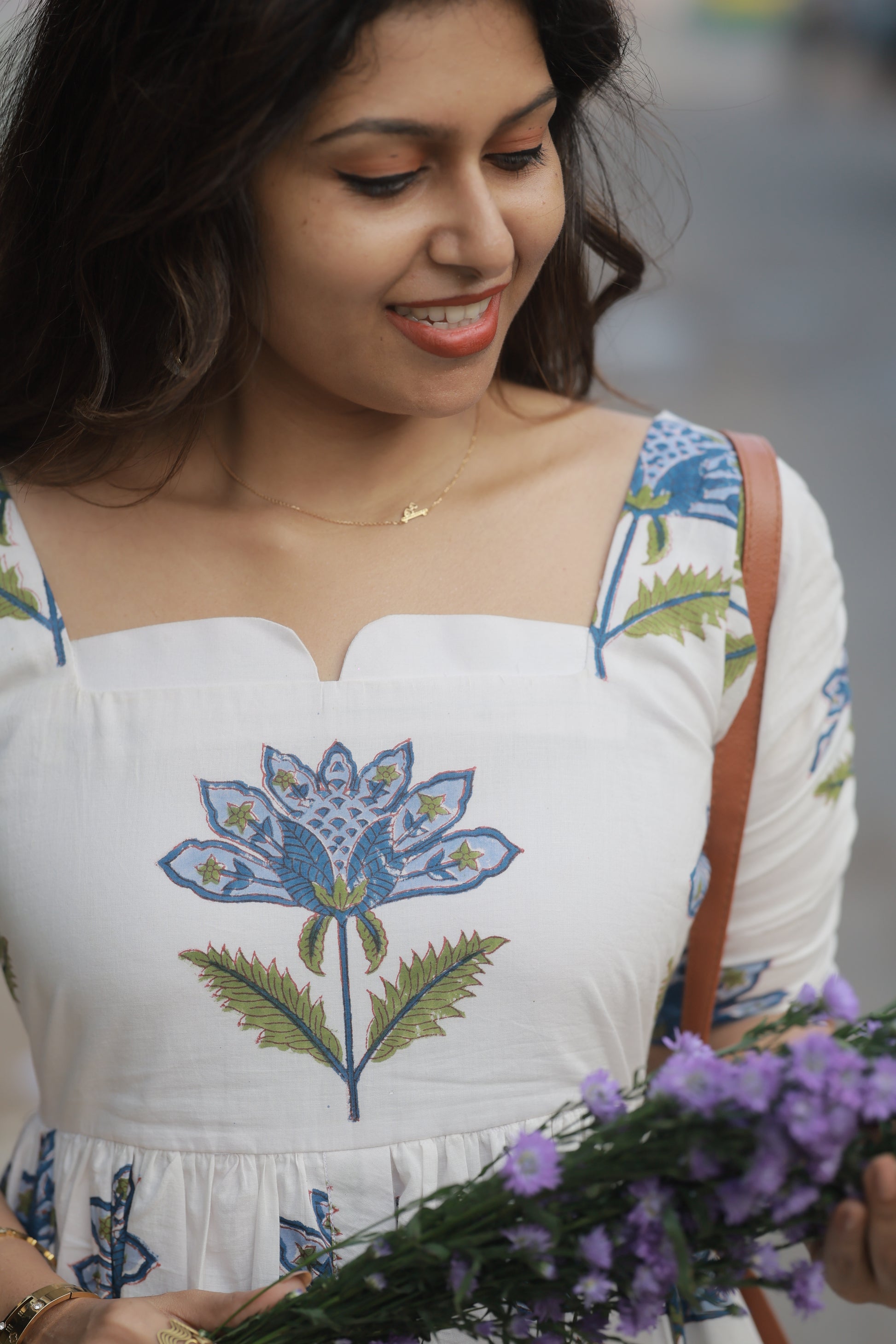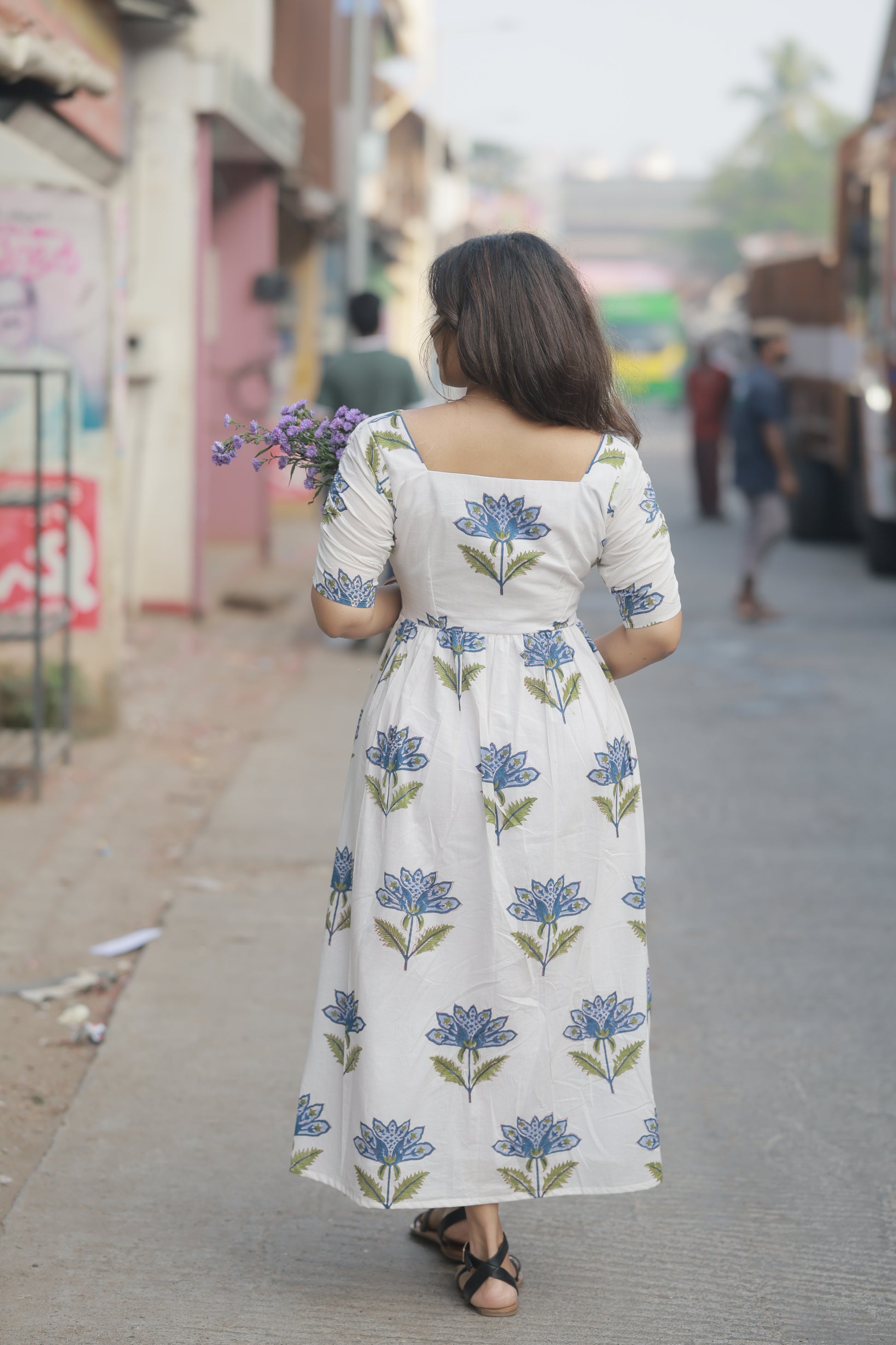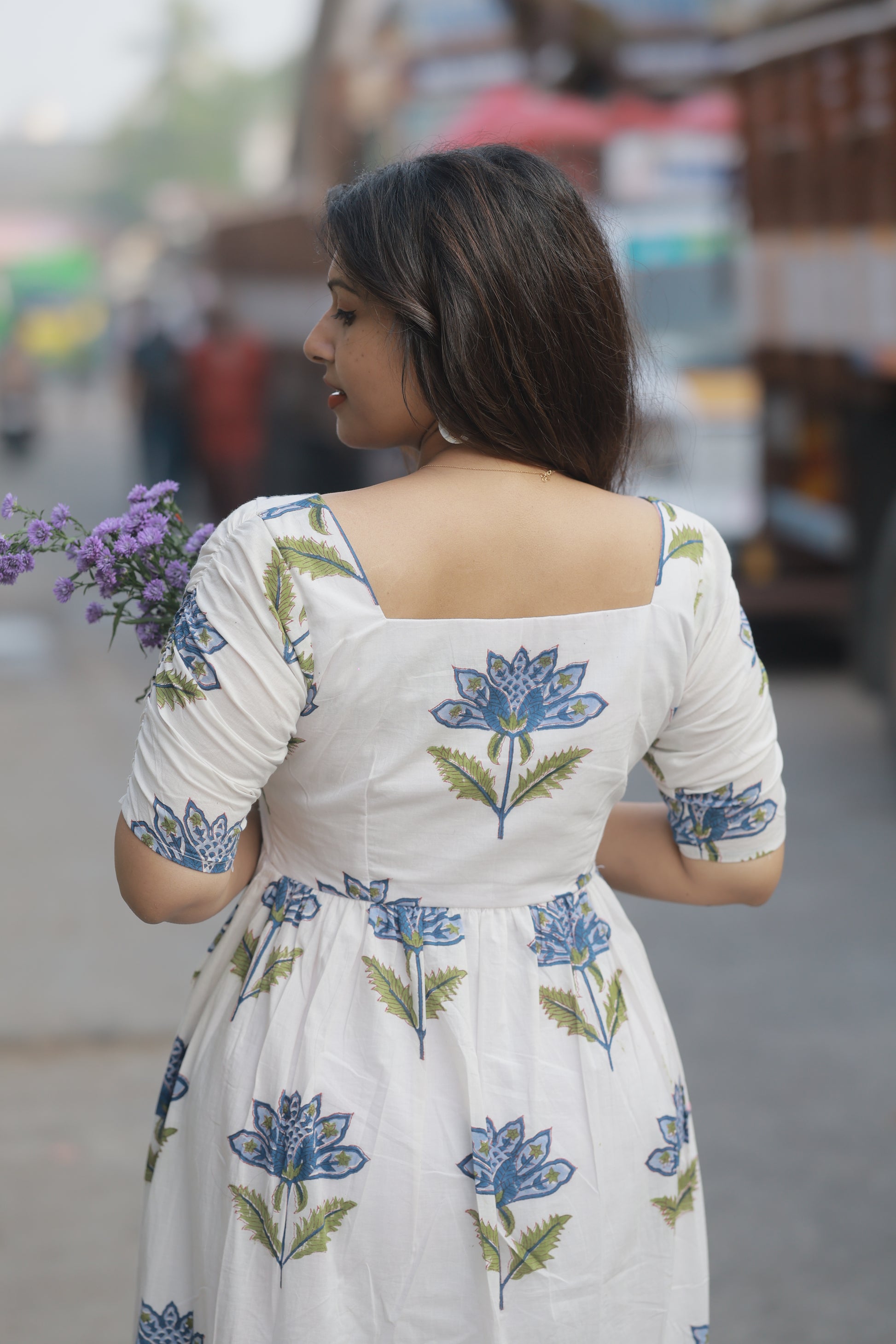 Introducing Hyacinth – a stunning white cotton dress adorned with delicate blue lotus motifs and olive green leaves. This fit-and-flare beauty combines vintage charm with contemporary elegance, creating a look that's both romantic and effortlessly chic.