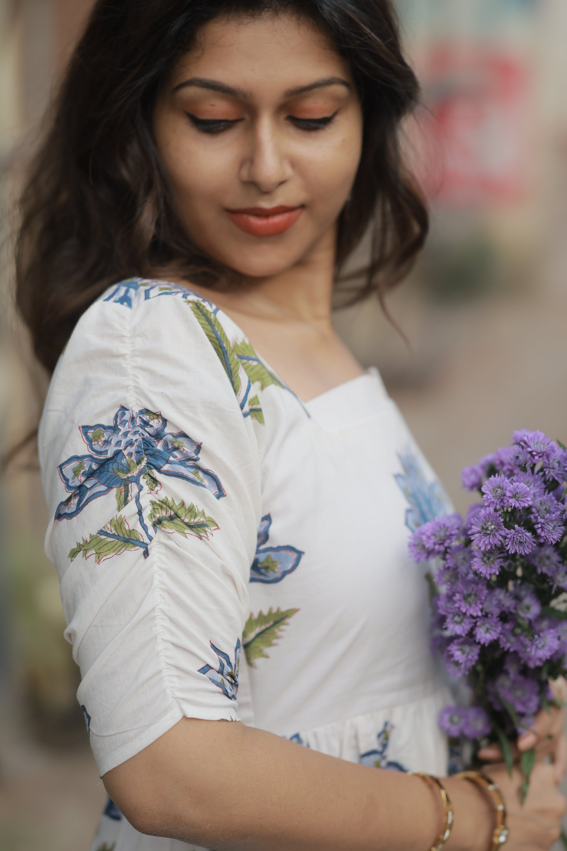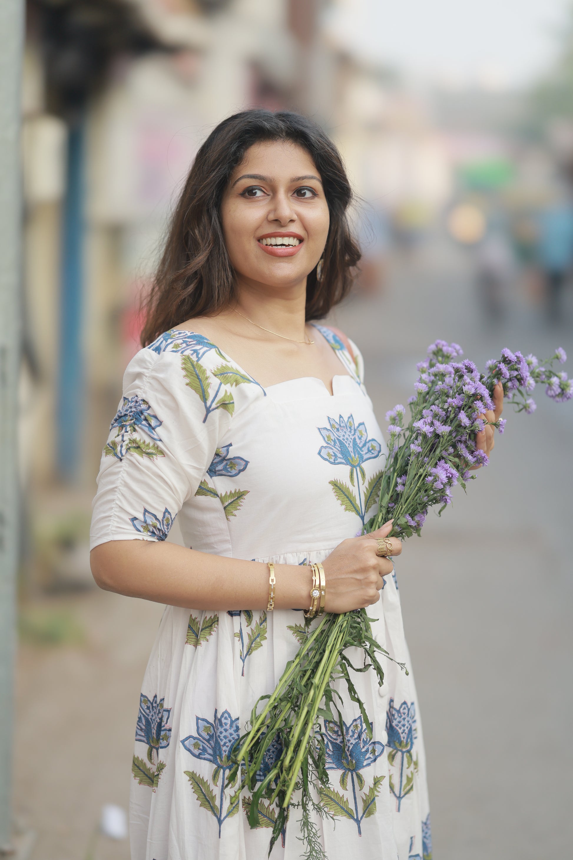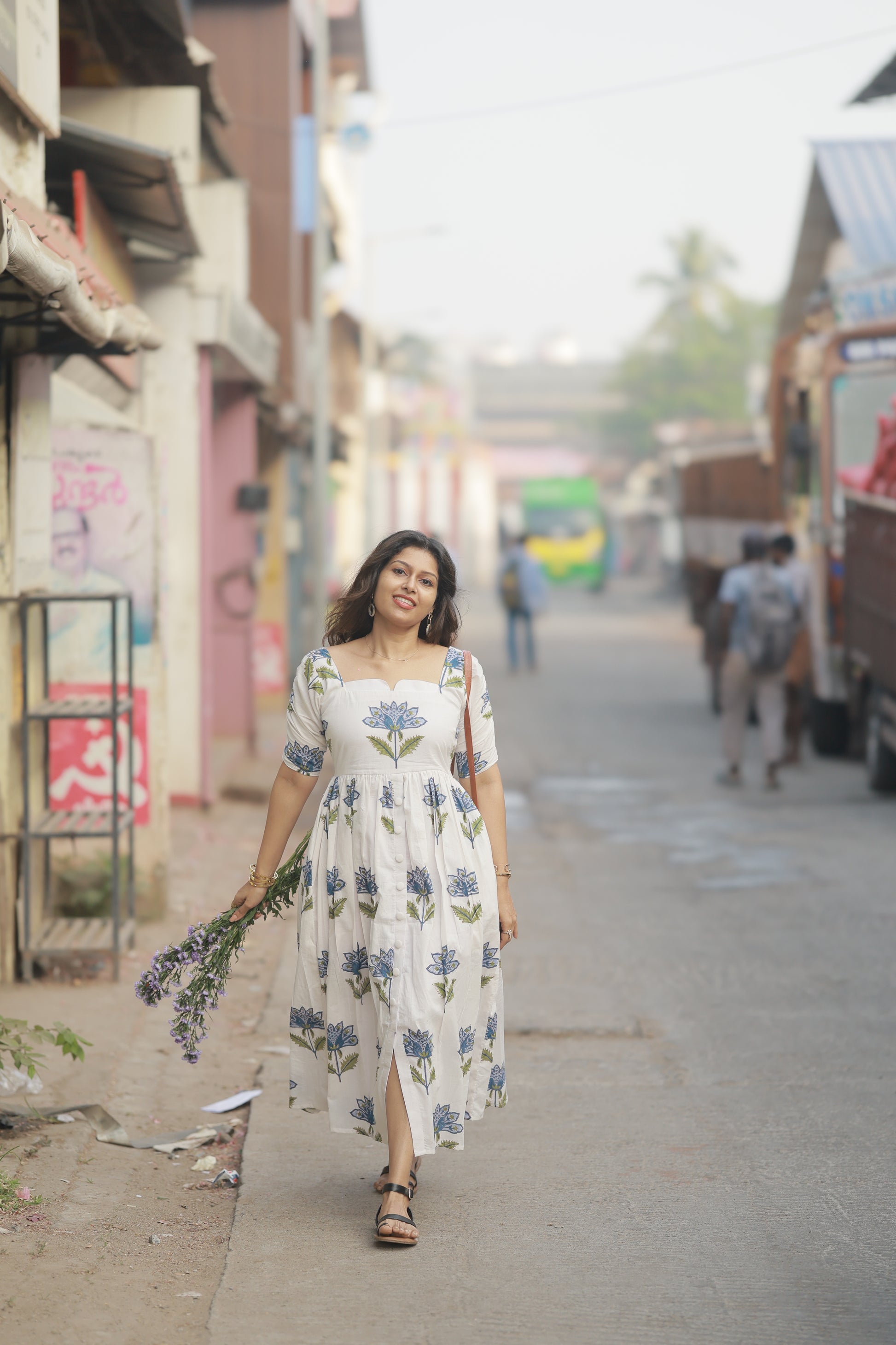 Introducing Hyacinth – a stunning white cotton dress adorned with delicate blue lotus motifs and olive green leaves. This fit-and-flare beauty combines vintage charm with contemporary elegance, creating a look that's both romantic and effortlessly chic.