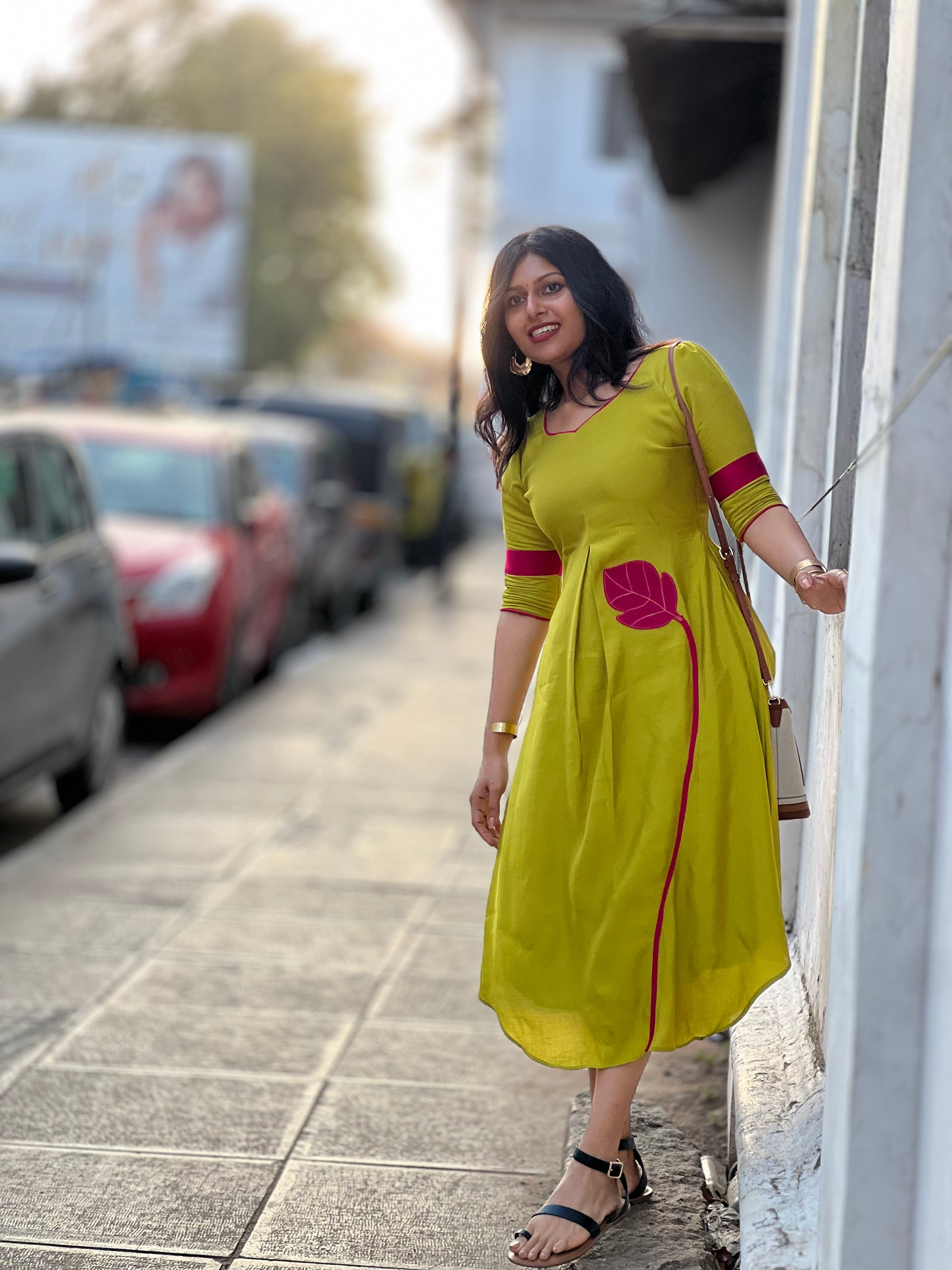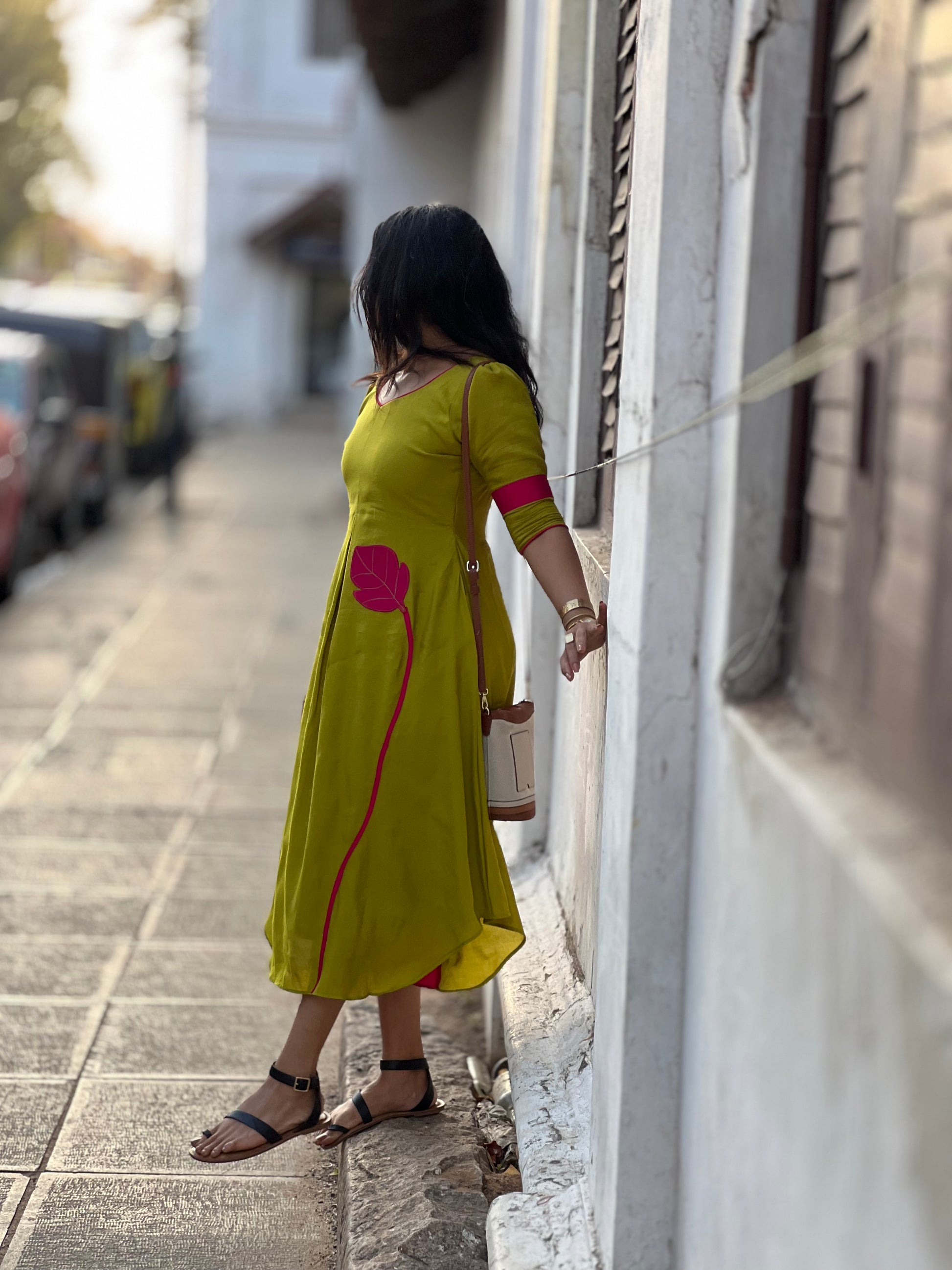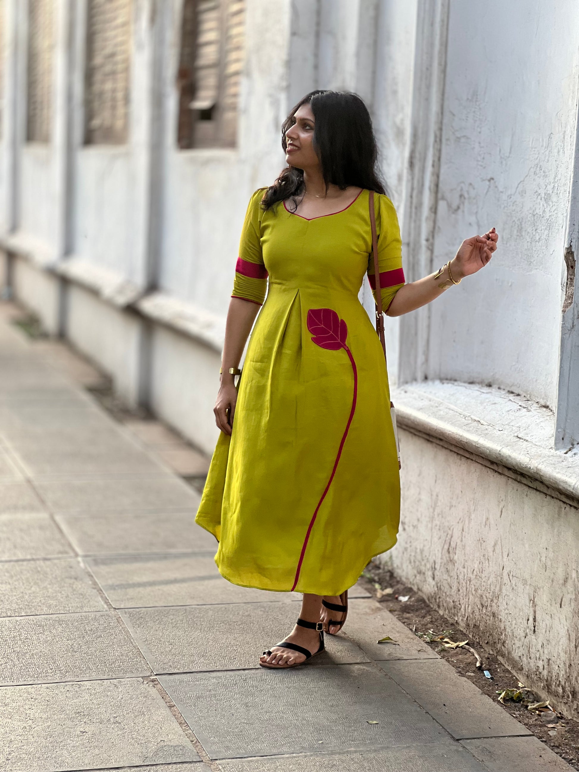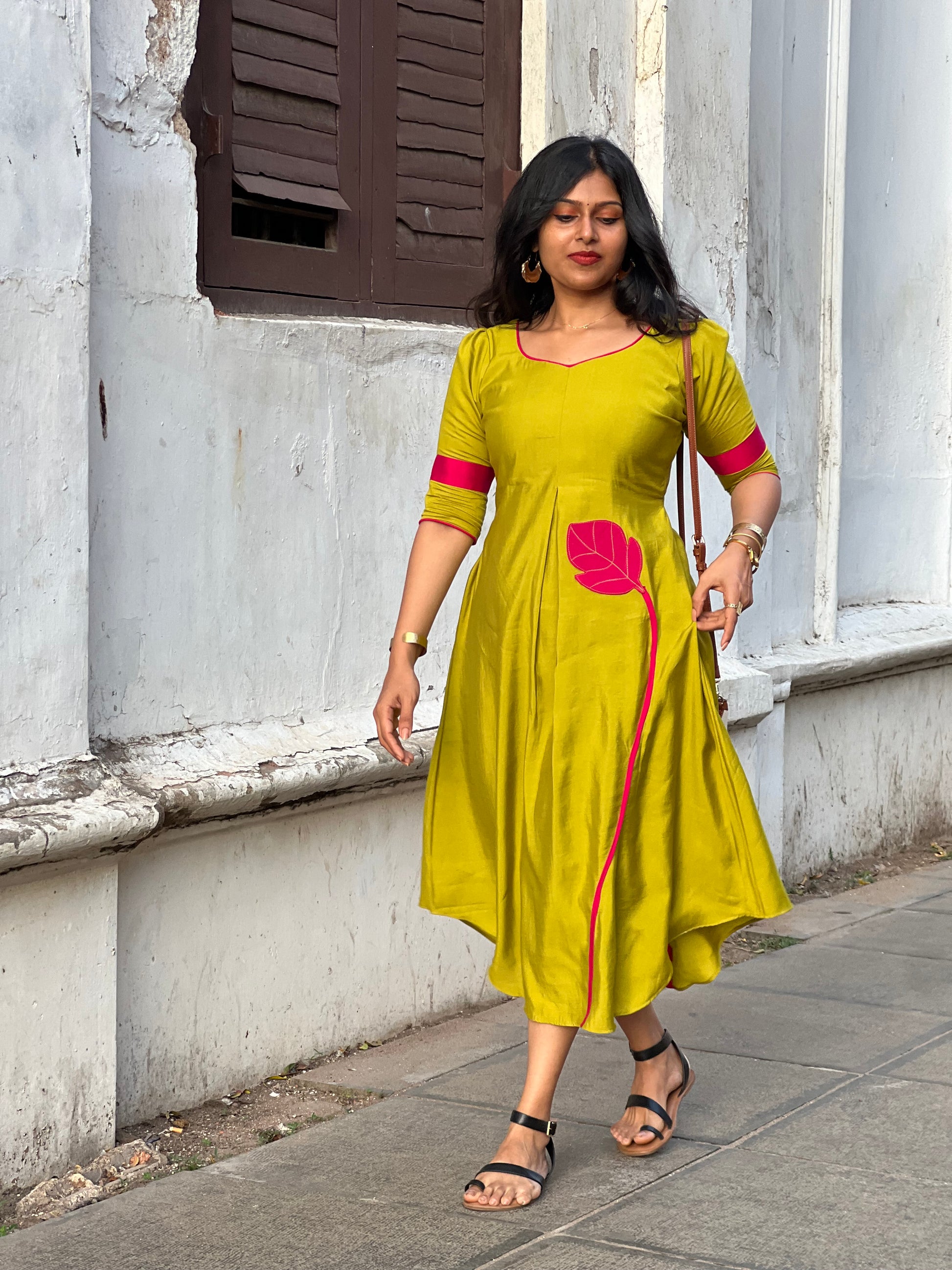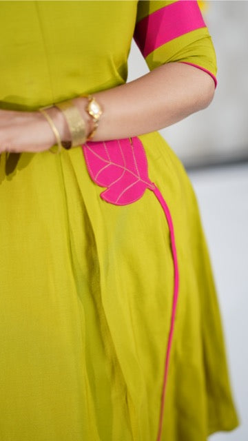 ✨ Featuring elegant leaf appliqués and a unique leaf-inspired neckline, this outfit blends tradition with a modern twist.