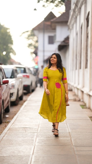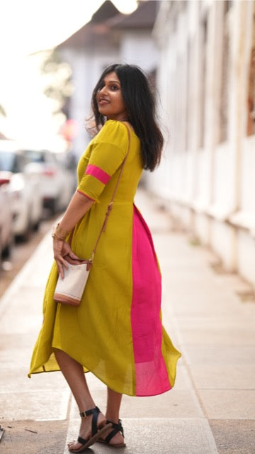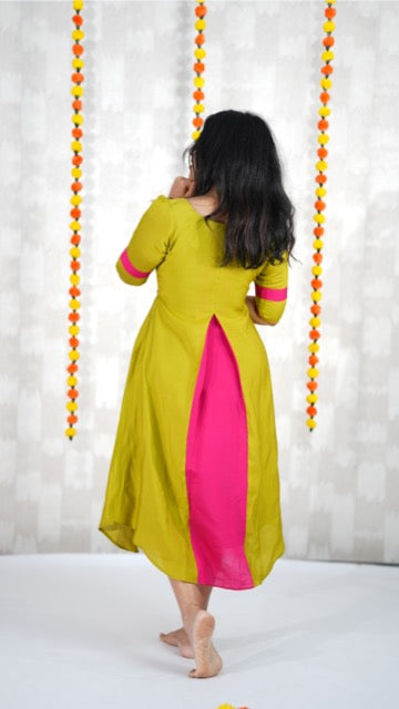 Turn heads effortlessly with Ilai, a masterpiece crafted in Chanderi foil fabric paired with dyed magenta Chanderi panels for a vibrant contrast.