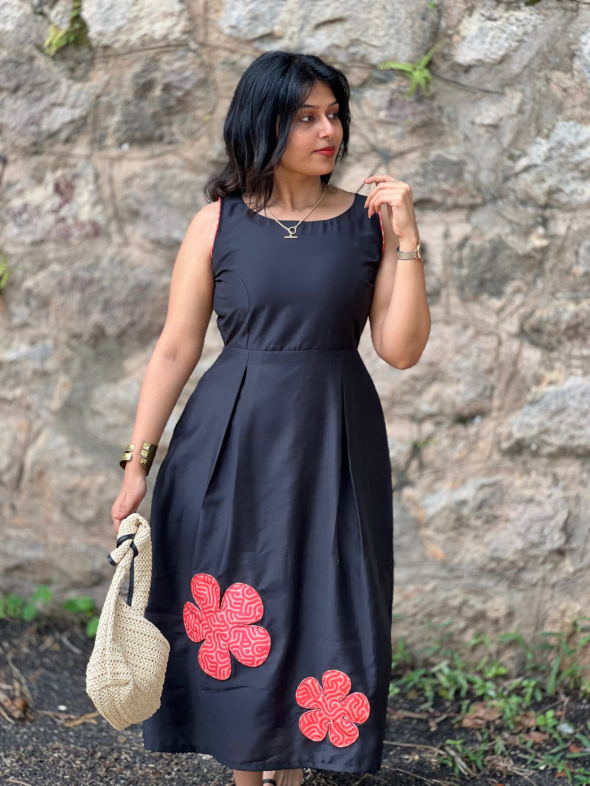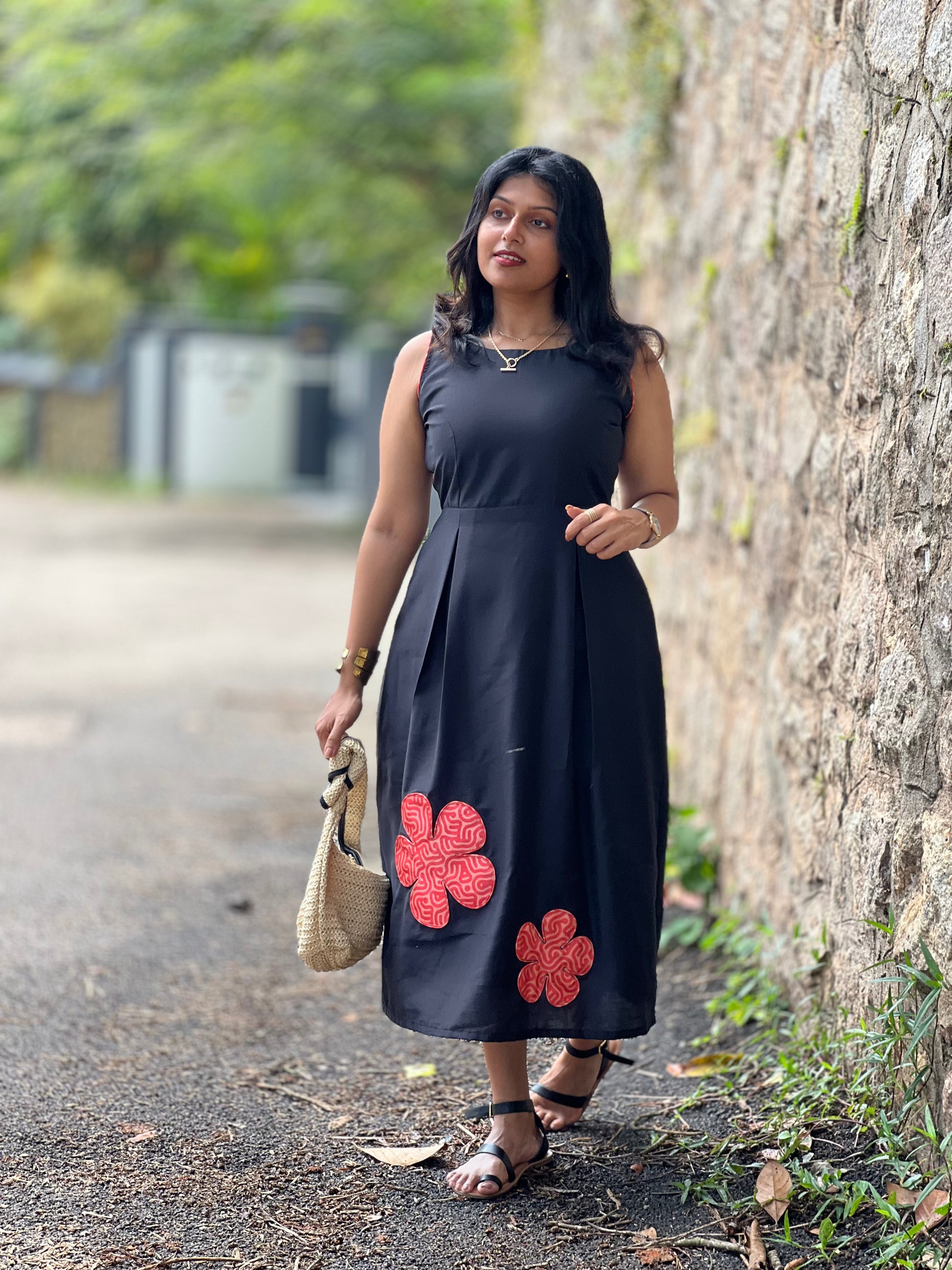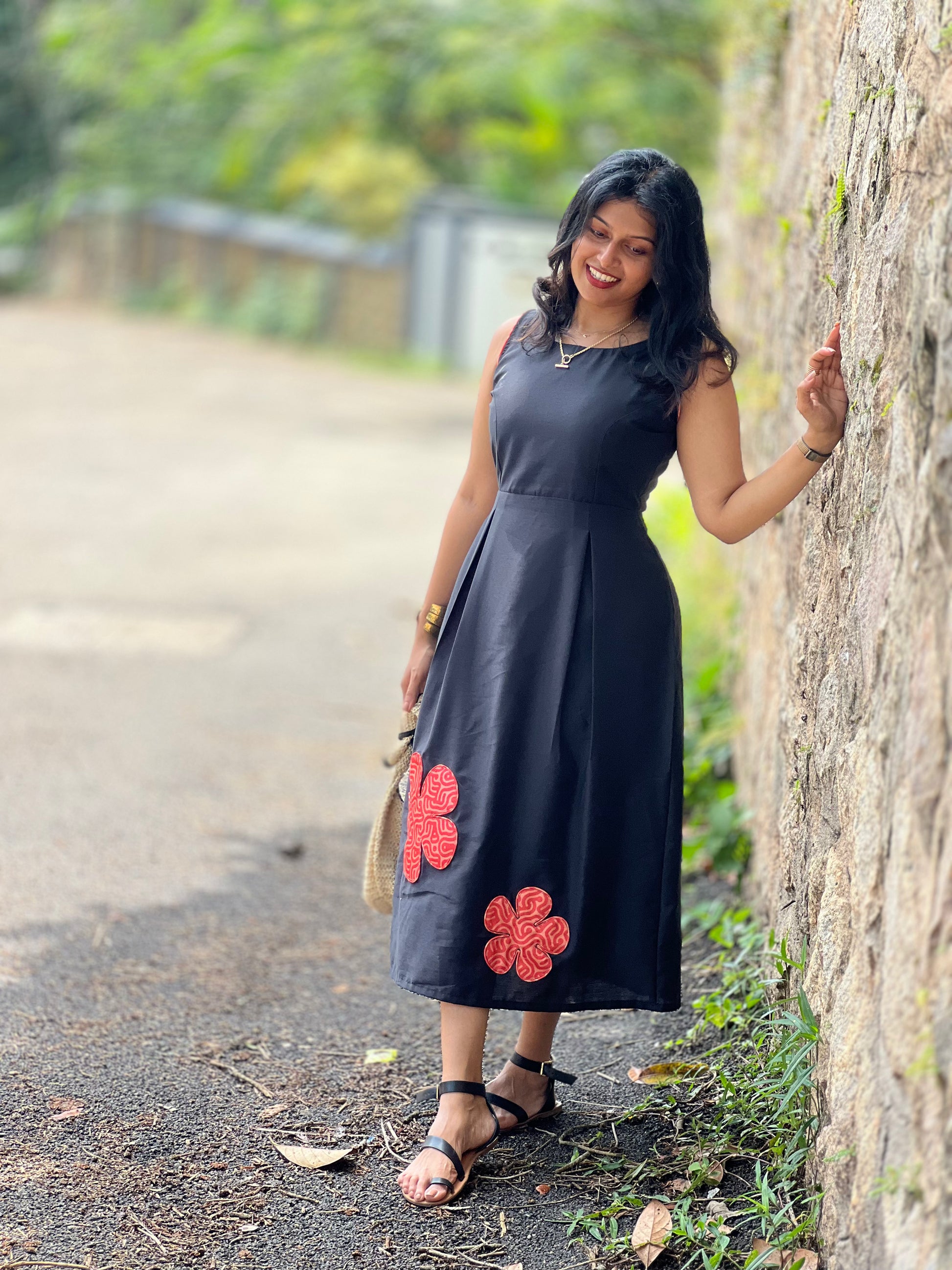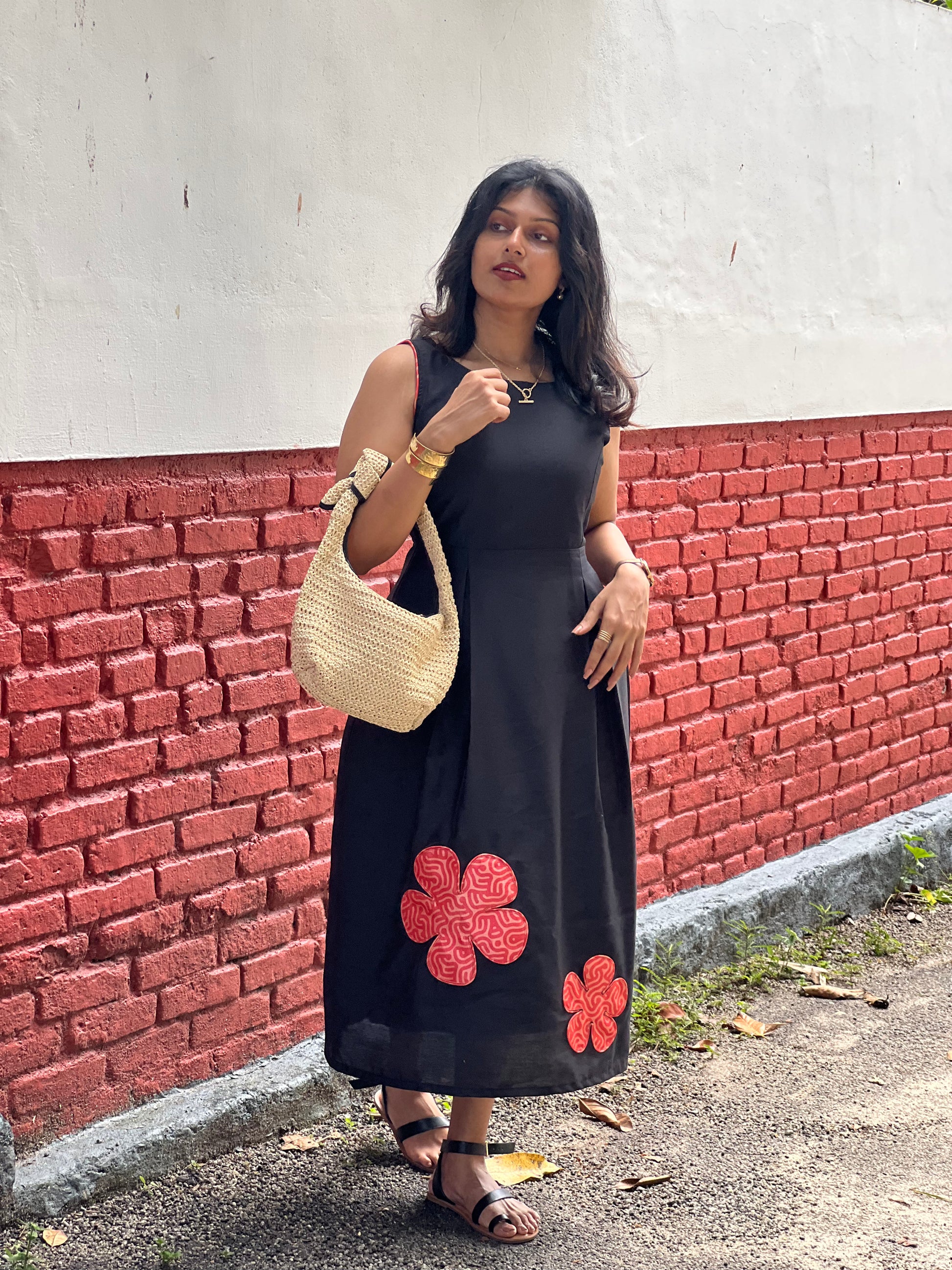 Step into effortless style with Ithal, a sleek black princess cut satin sleeveless midi dress featuring vibrant bamboo silk floral appliqués 🌺. Designed for women who love comfort and style, this dress is perfect for casual outings, brunch dates, or evening get-togethers.