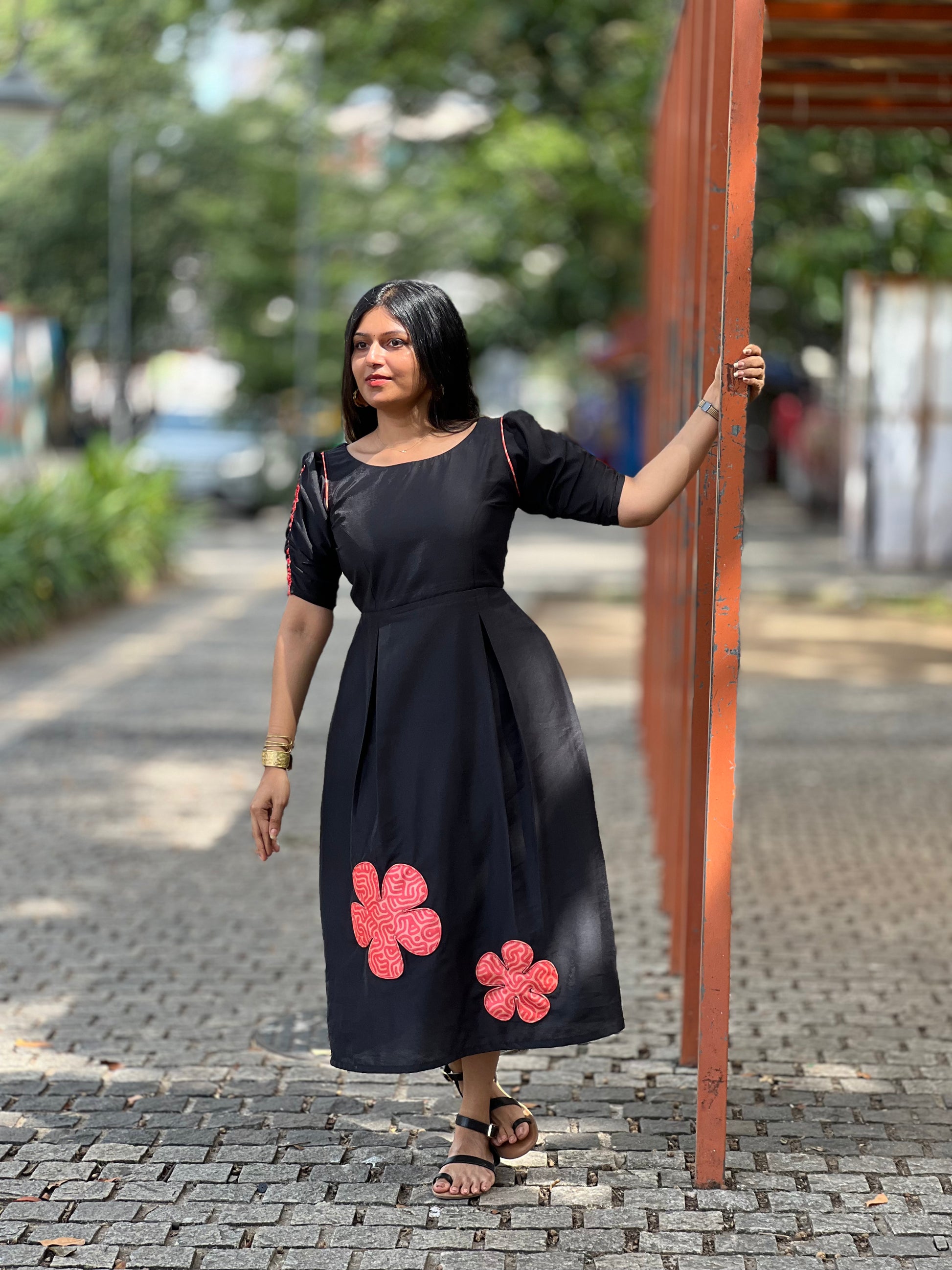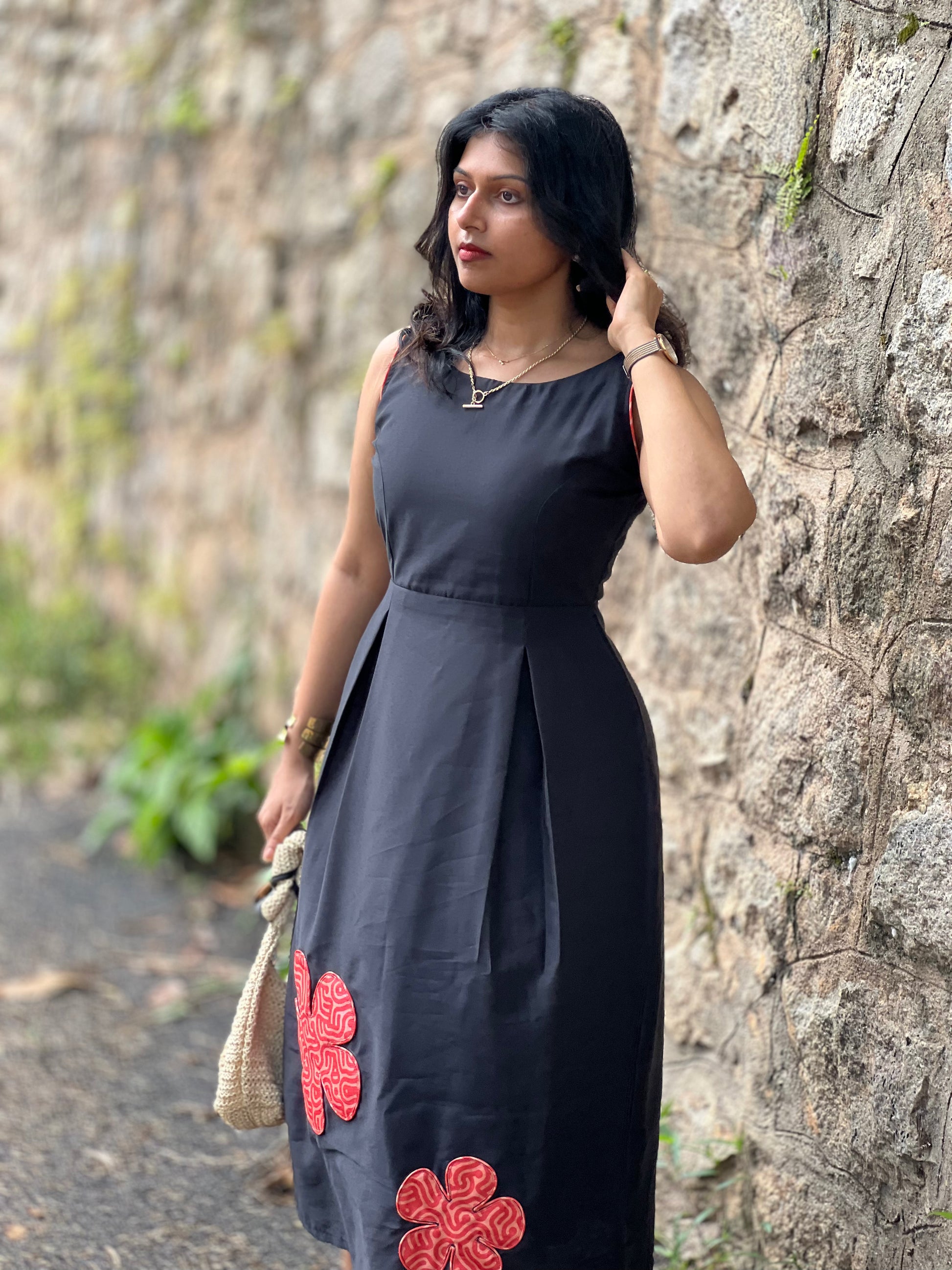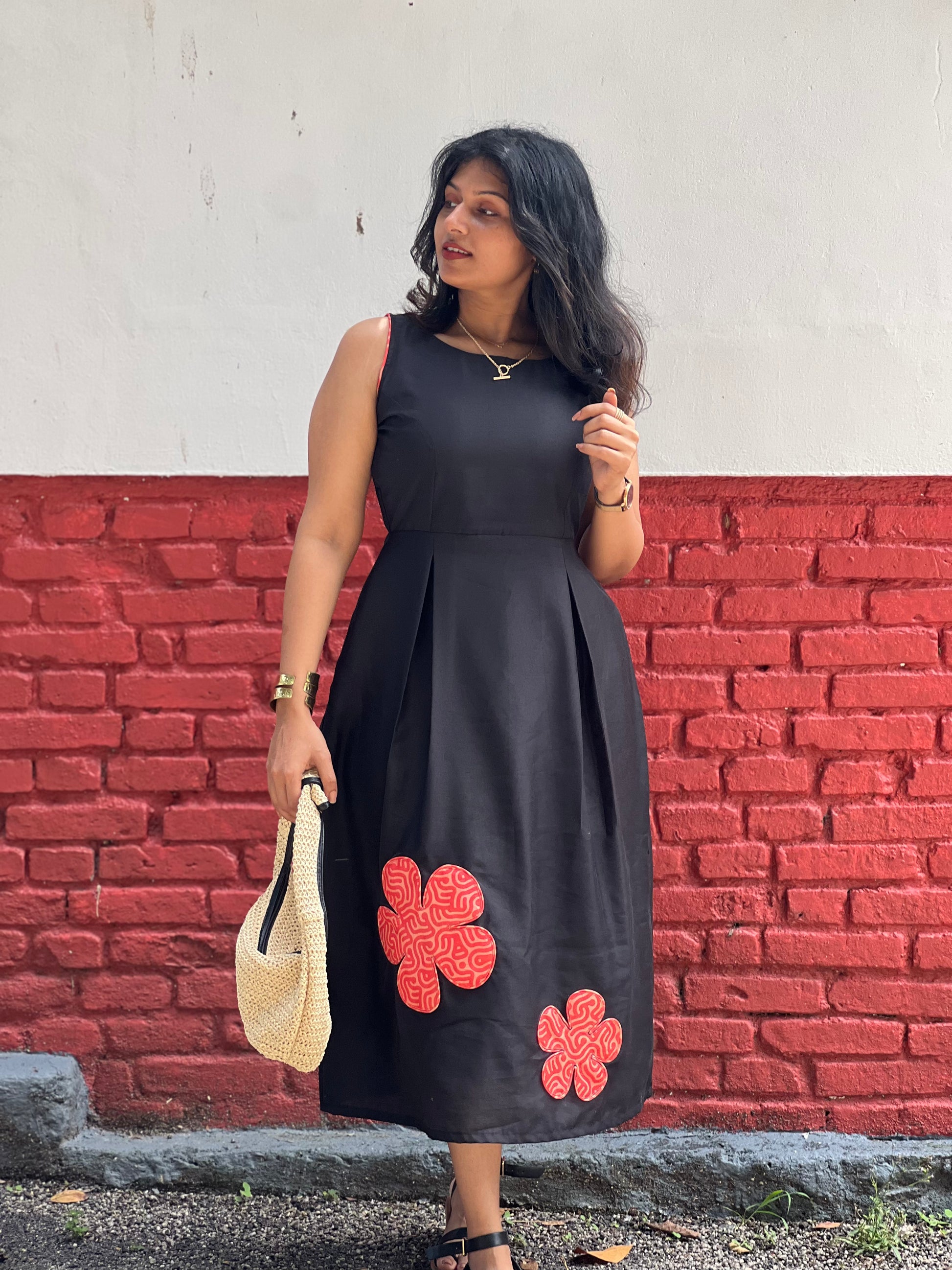 Step into effortless style with Ithal, a sleek black princess cut satin sleeveless midi dress featuring vibrant bamboo silk floral appliqués 🌺. Designed for women who love comfort and style, this dress is perfect for casual outings, brunch dates, or evening get-togethers.