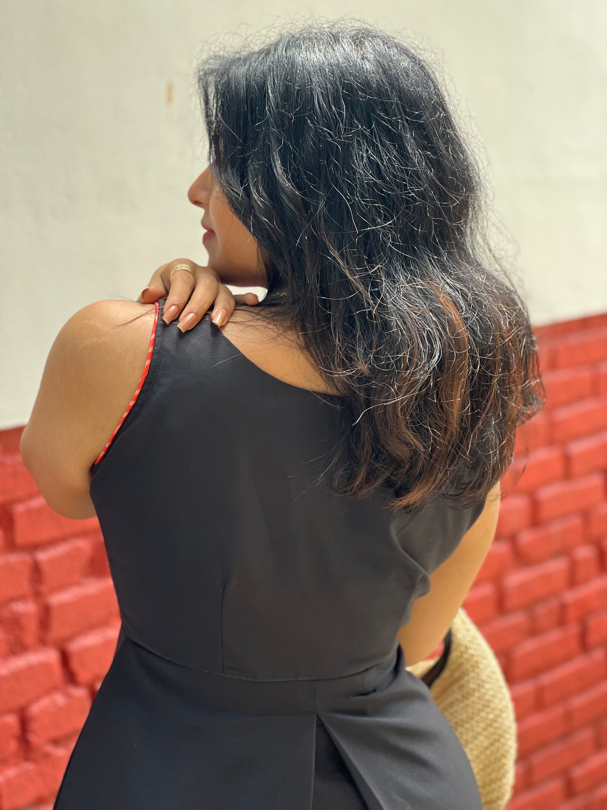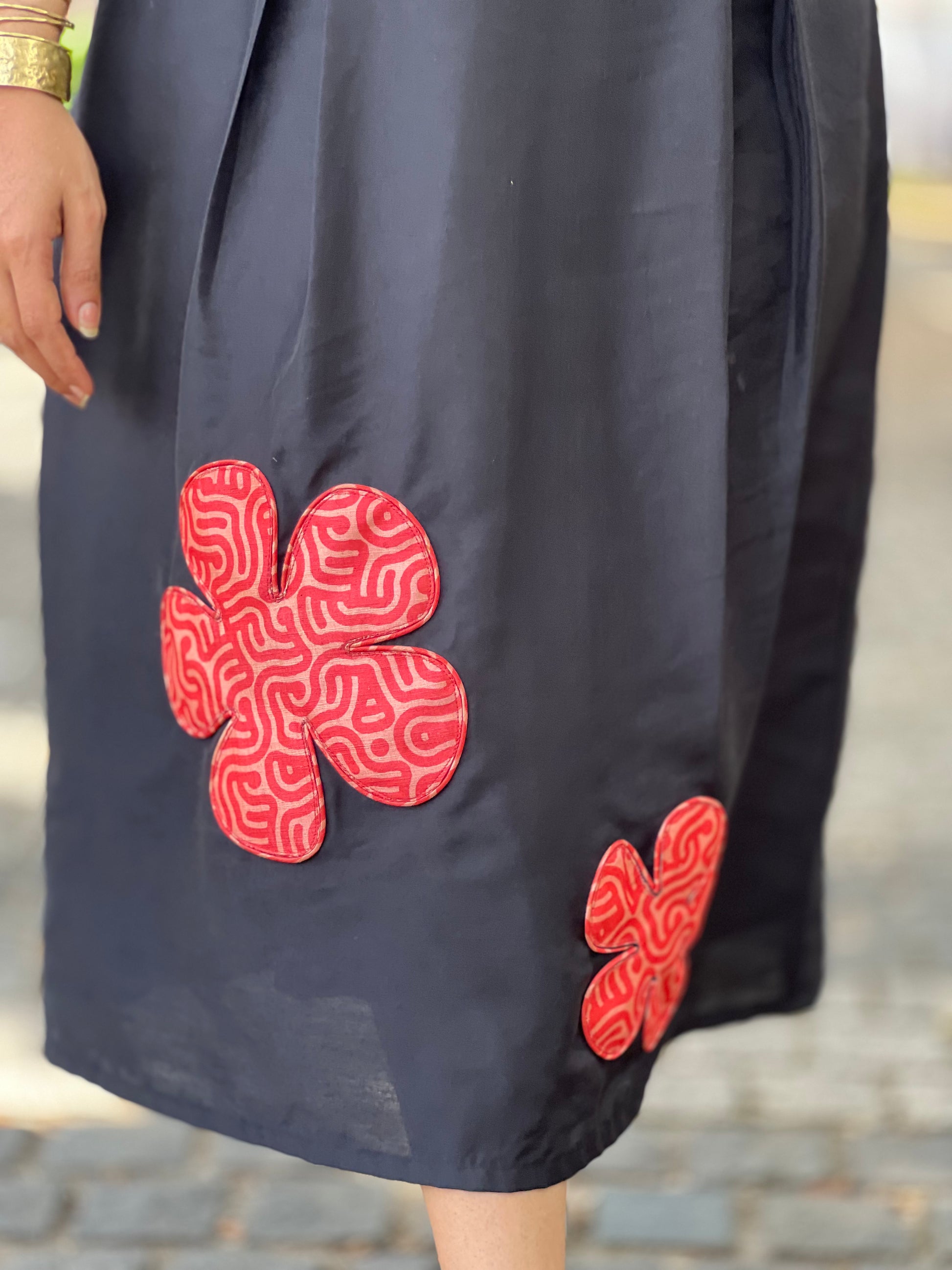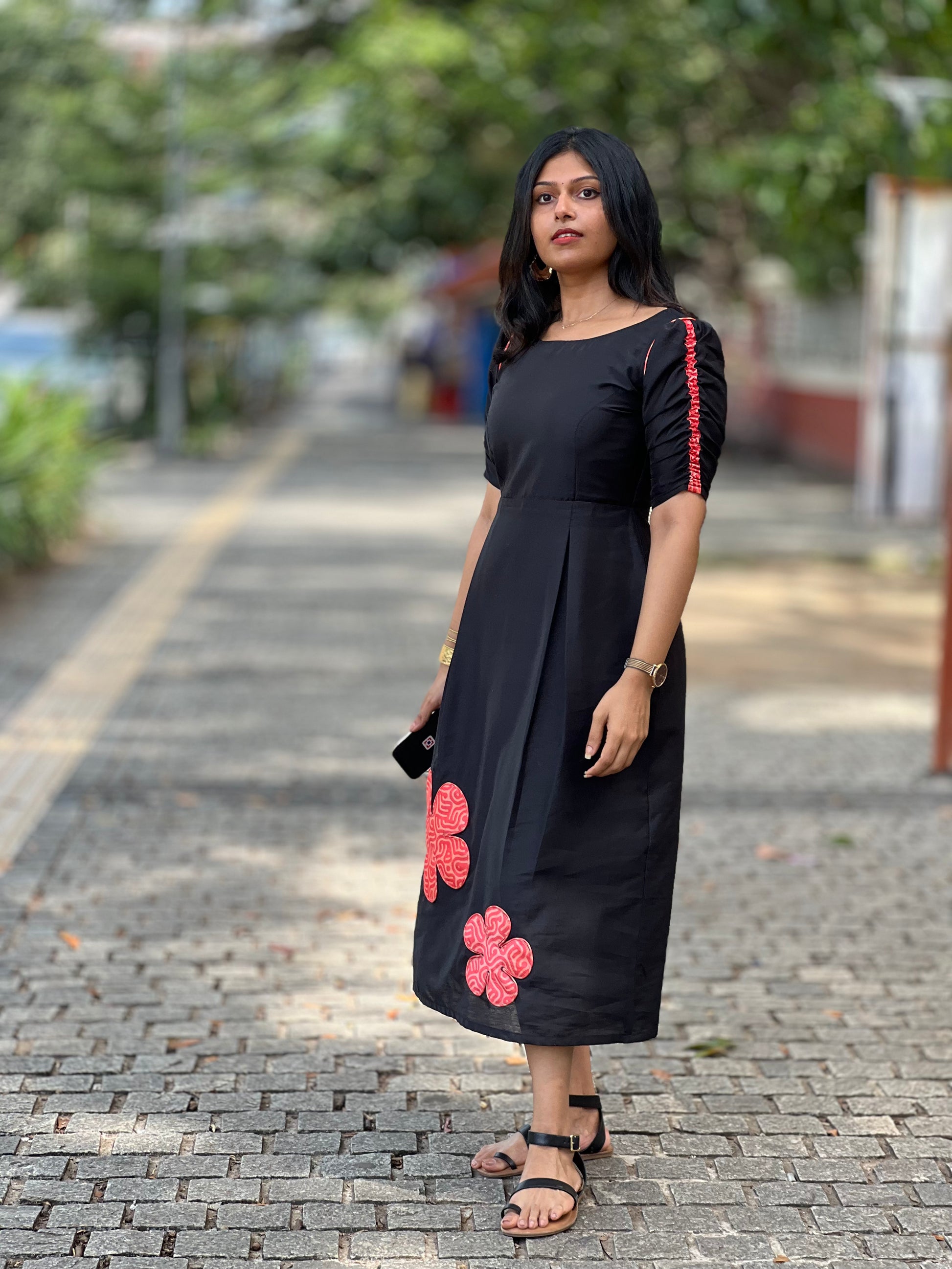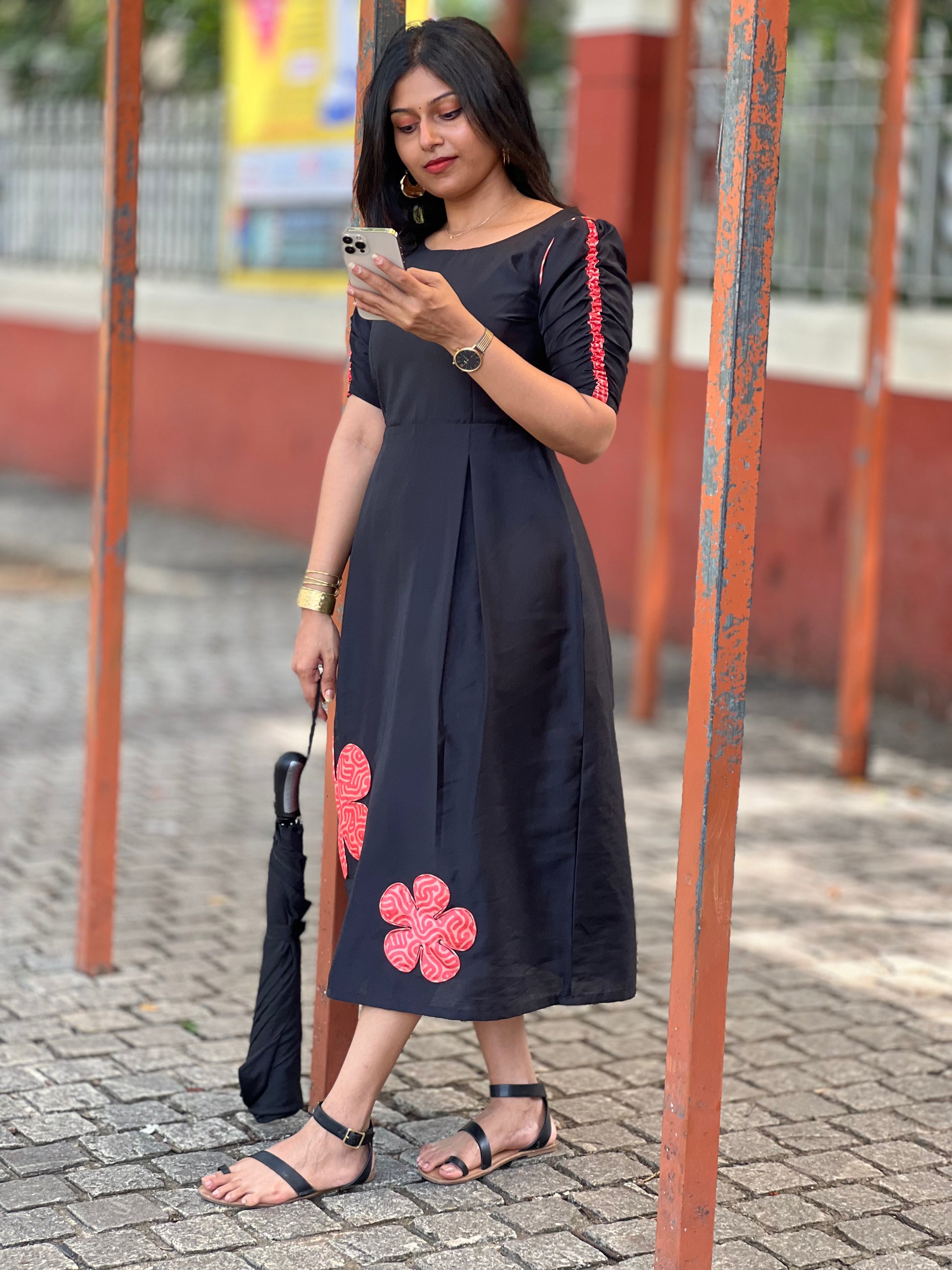 Step into effortless style with Ithal, a sleek black princess cut satin sleeveless midi dress featuring vibrant bamboo silk floral appliqués 🌺. Designed for women who love comfort and style, this dress is perfect for casual outings, brunch dates, or evening get-togethers.