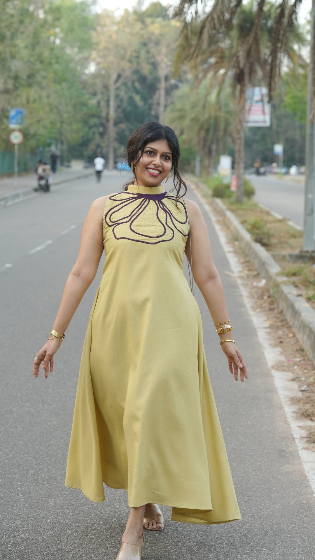 Designed with a flattering semi-umbrella silhouette, it flows beautifully with every movement. The delicate applique floral design on the front enhances its charm, making it a standout piece while keeping the look minimal and refined.