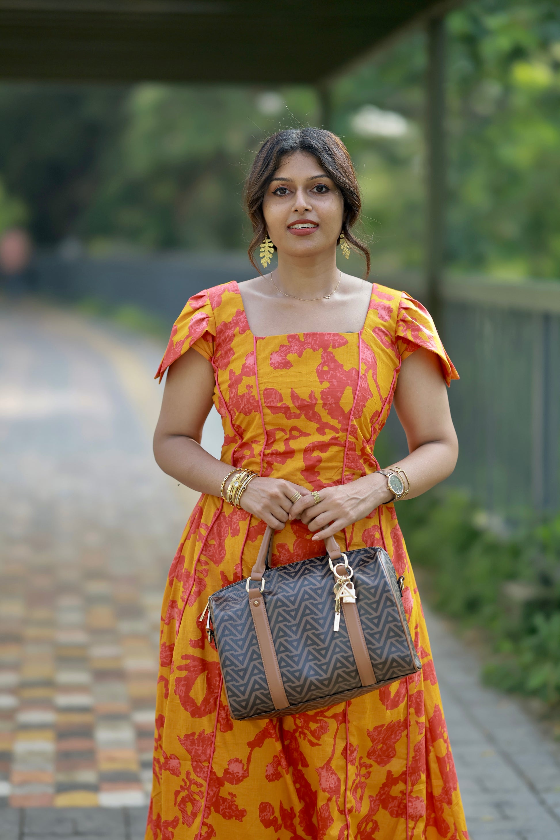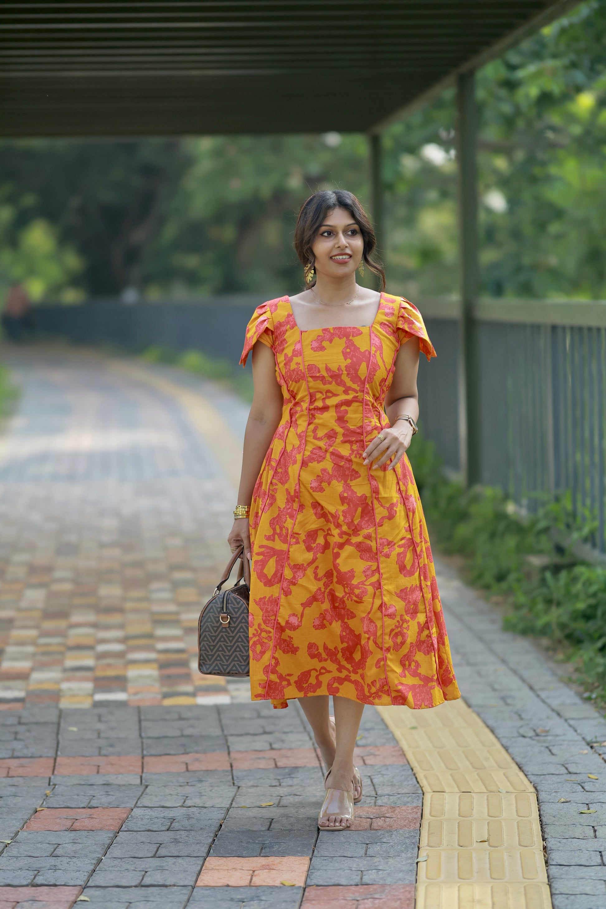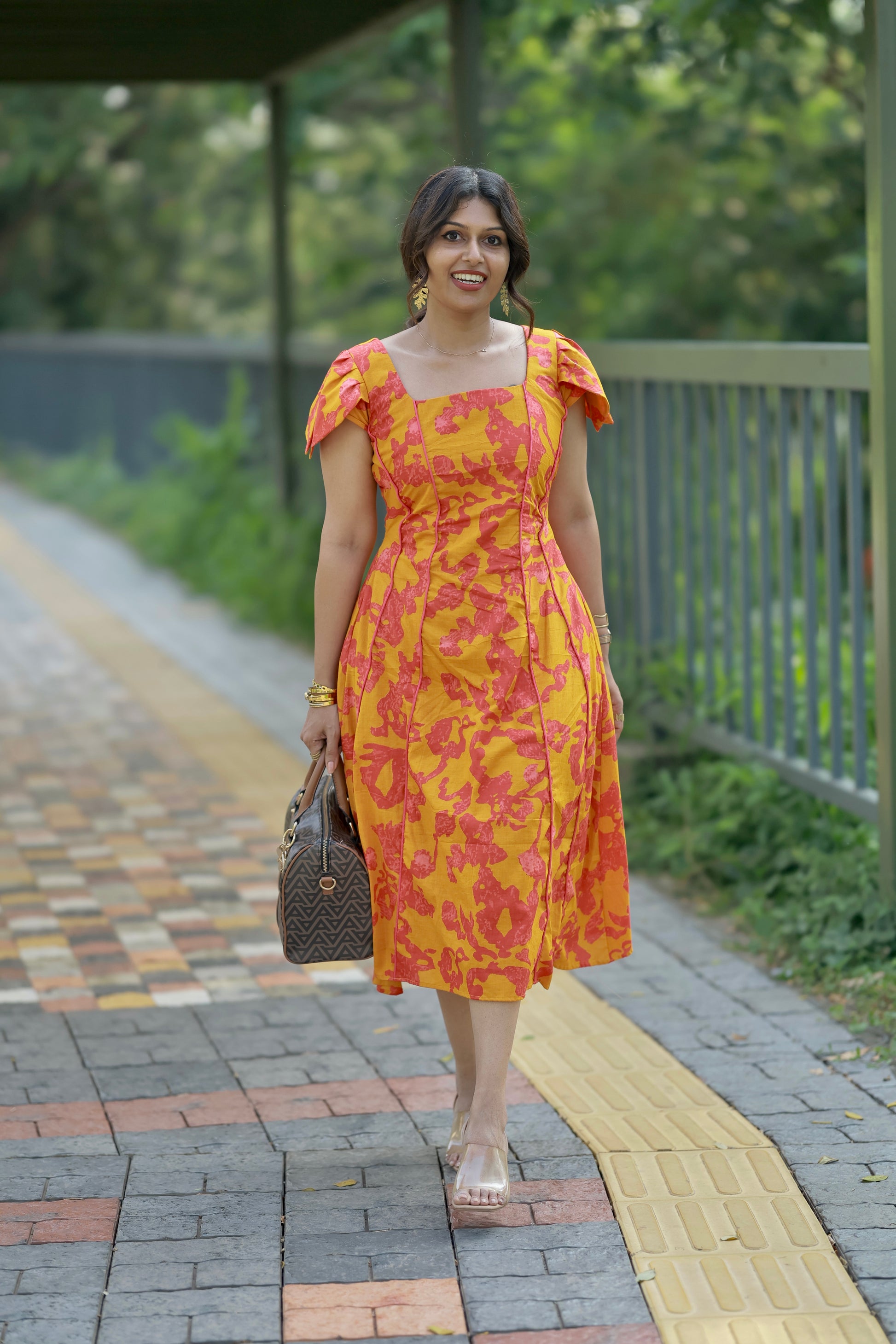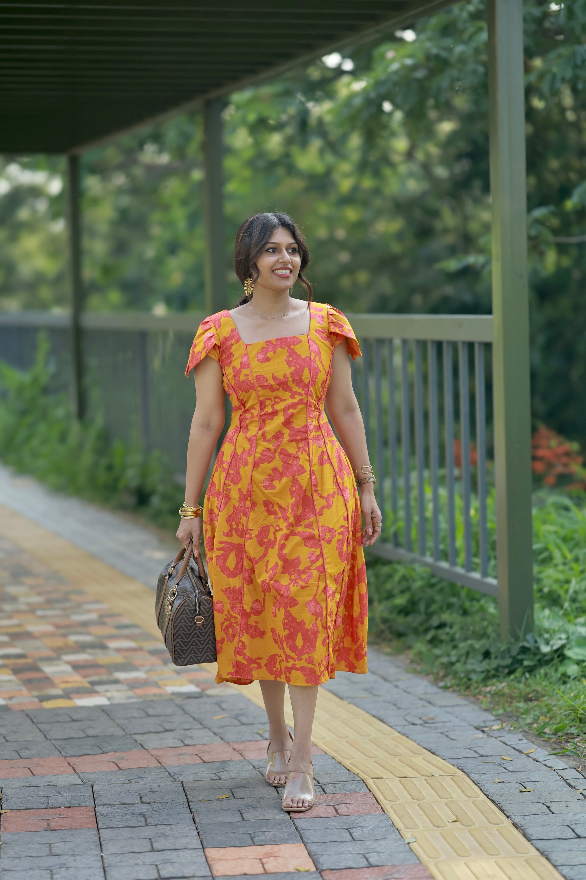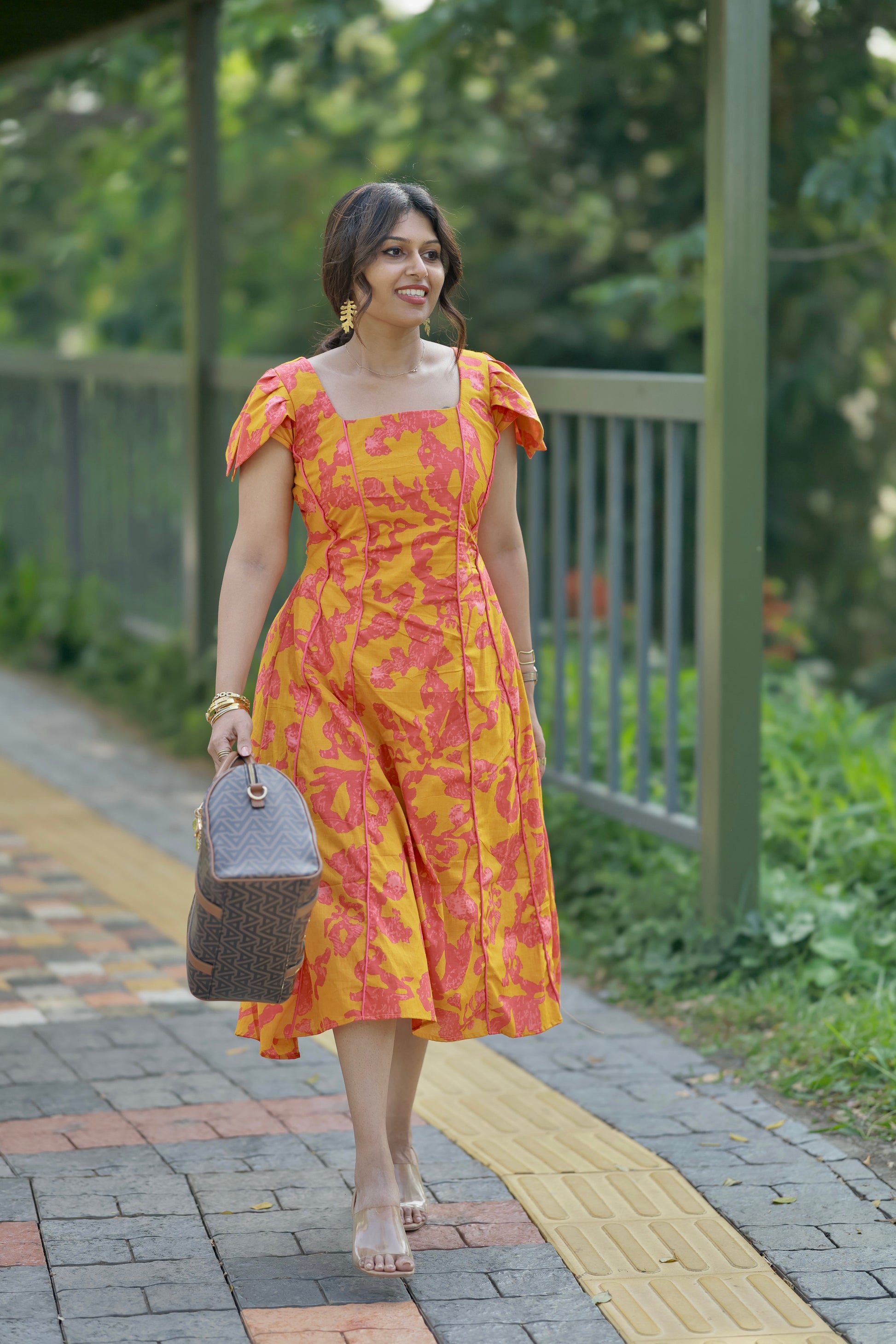 Crafted in a premium abstract floral print fabric featuring dimensional rose-inspired designs throughout. The rich fiery coral-pink floral motifs create a beautiful tonal harmony against the golden-yellow base, making this floral midi dress a radiant statement piece that captures the light perfectly.