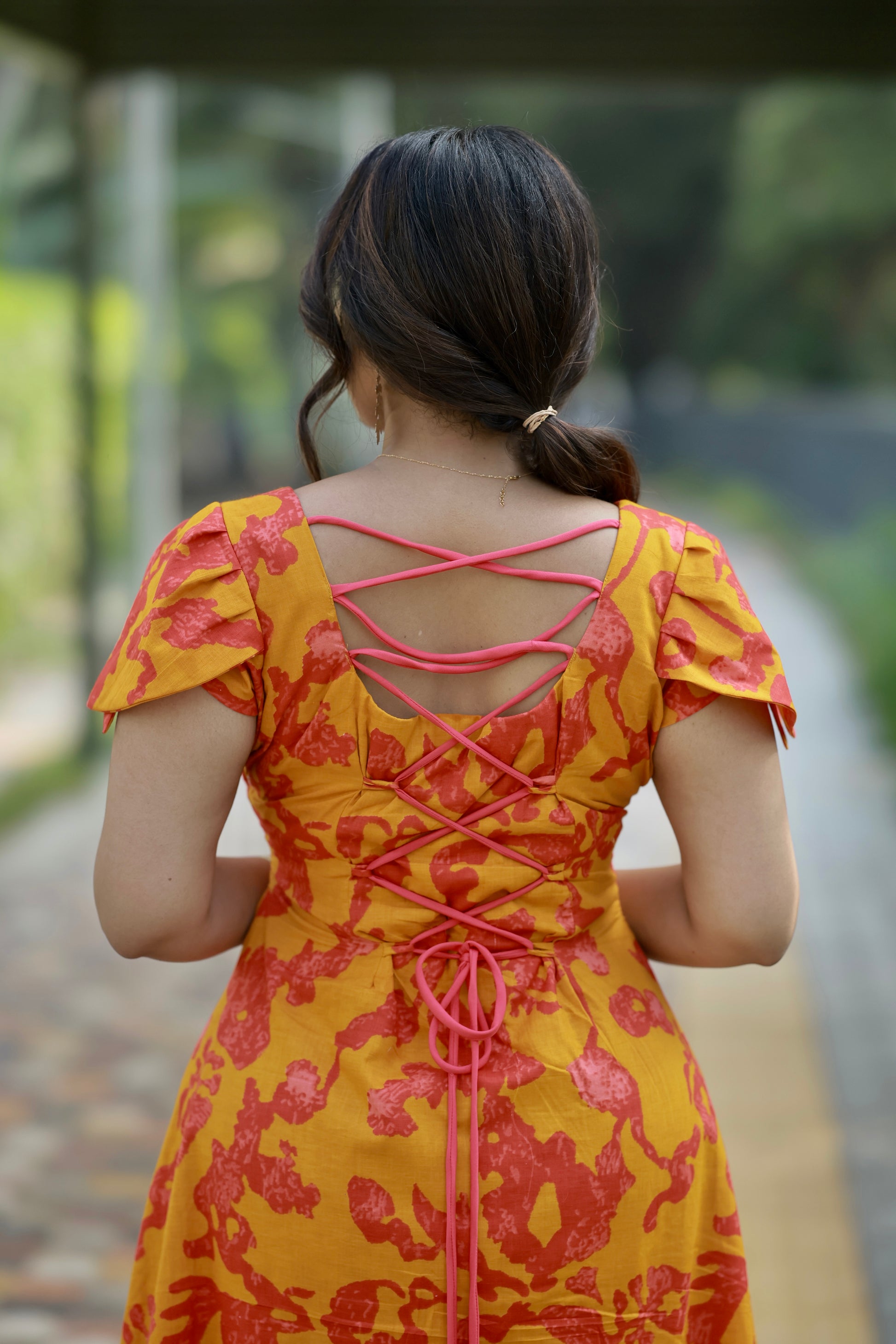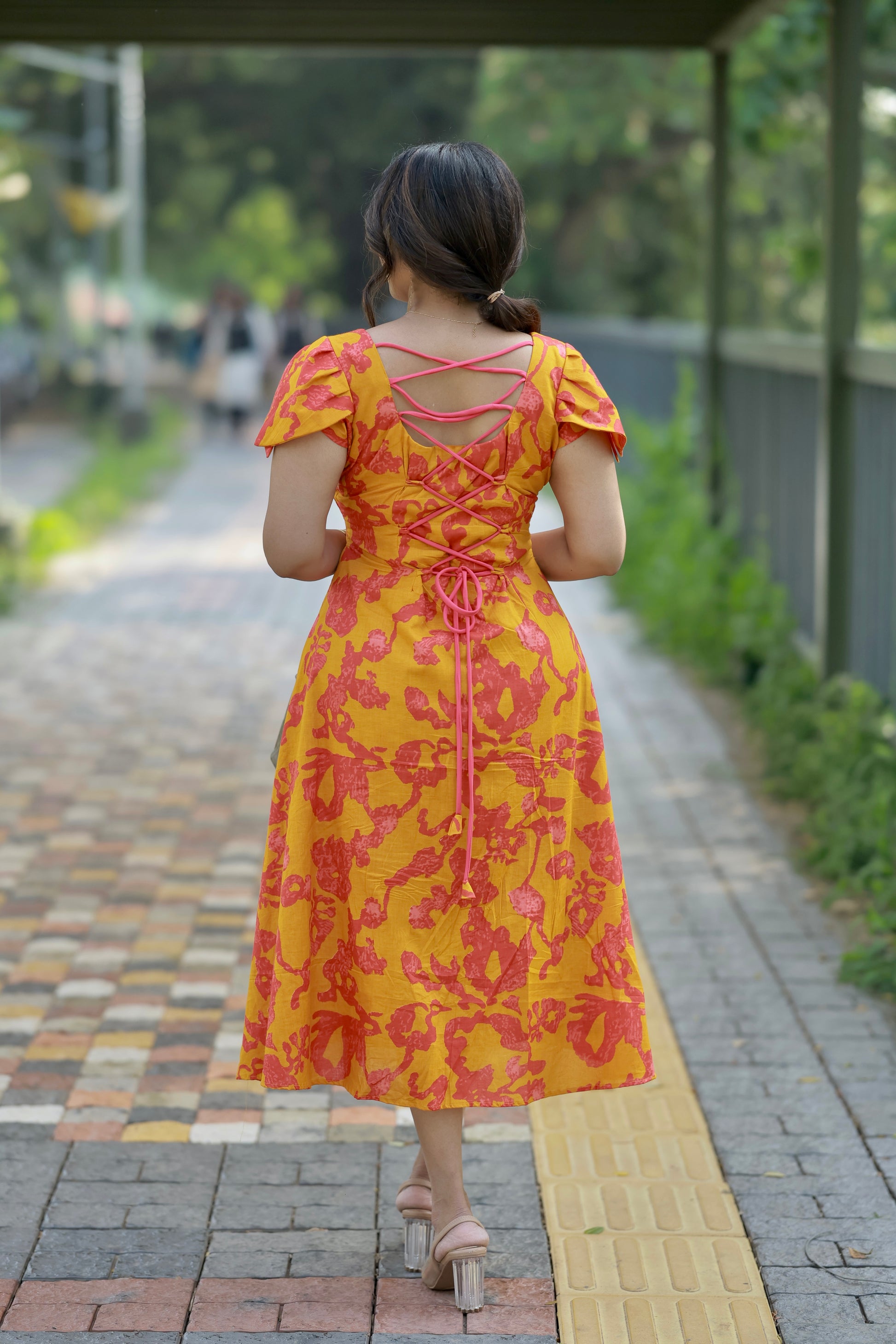 Discover elegance in every detail with this floral A-line midi dress, featuring a sophisticated corset-style construction and romantic petal sleeves. This stunning abstract floral print dress showcases vibrant coral-pink blooms dancing across a sun-drenched marigold yellow base, creating an artistic motif that's both warm and striking.
