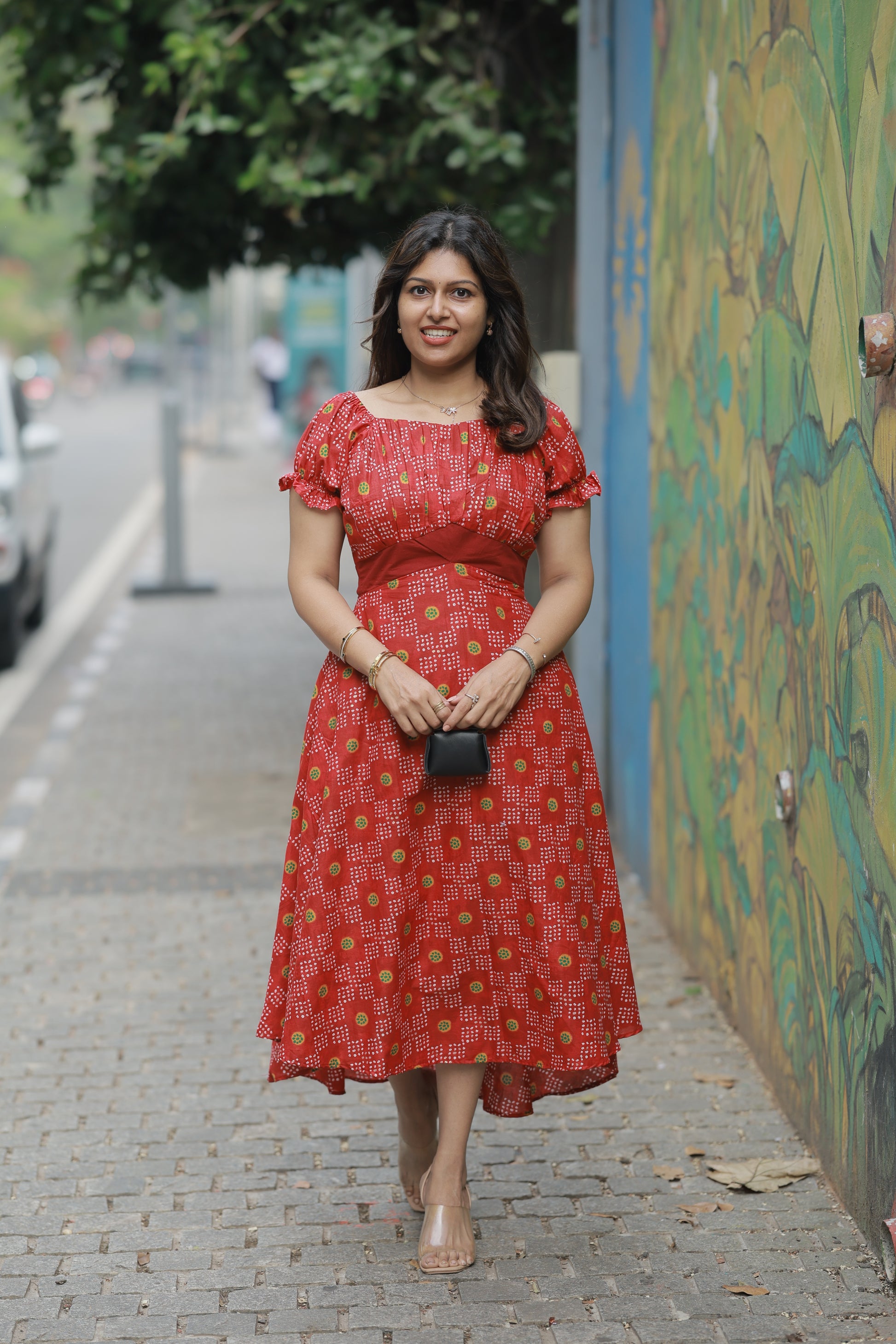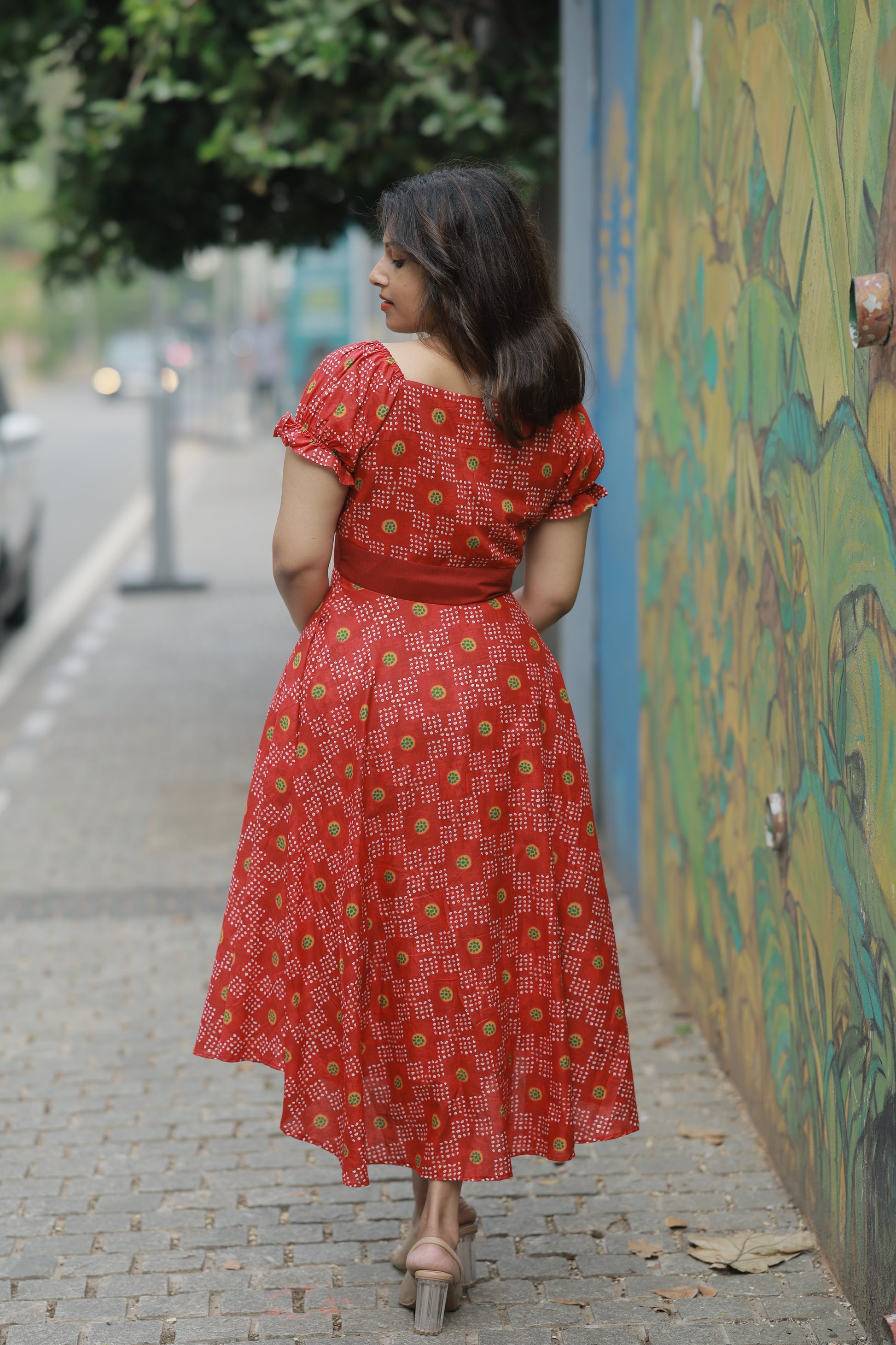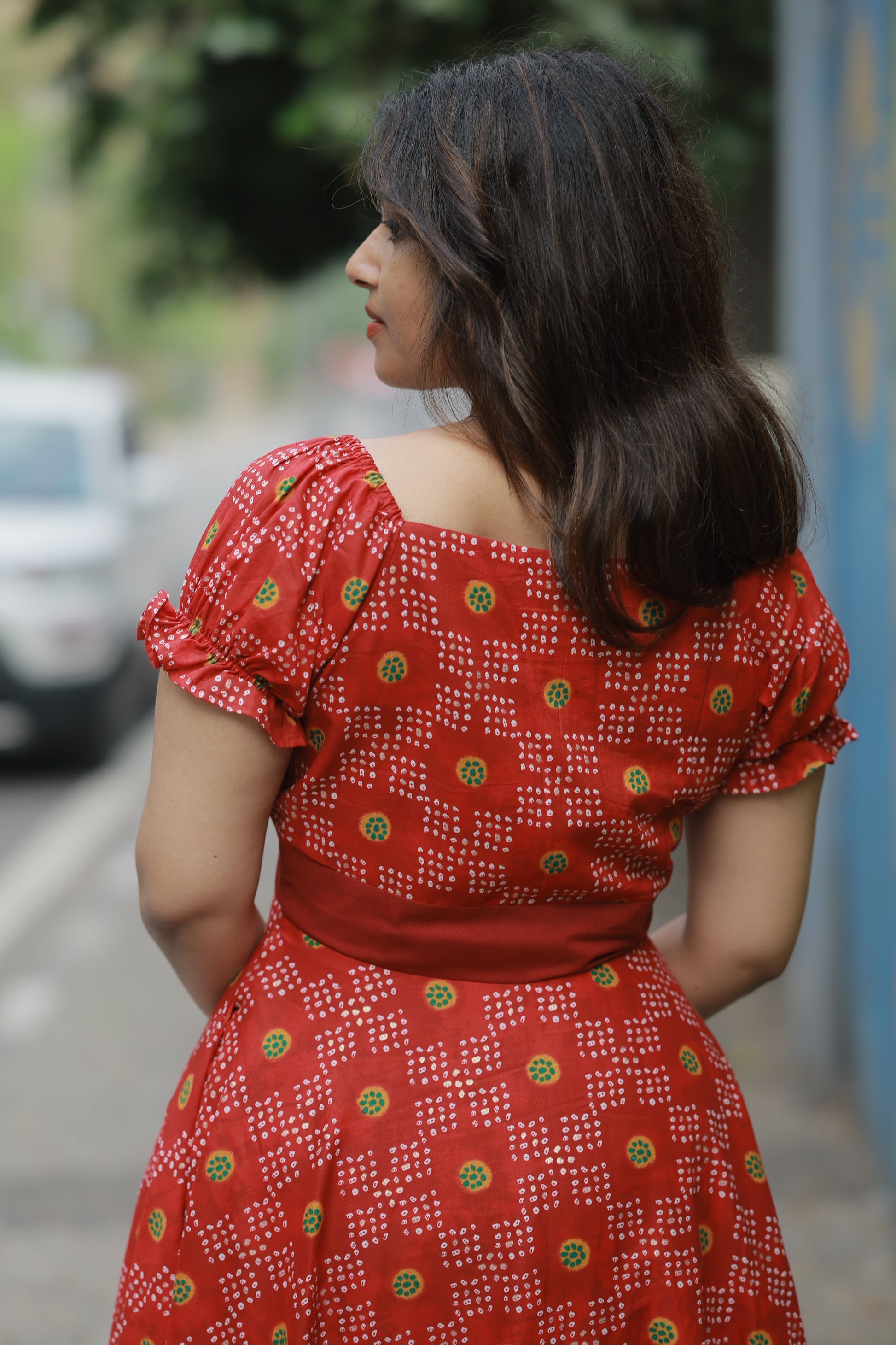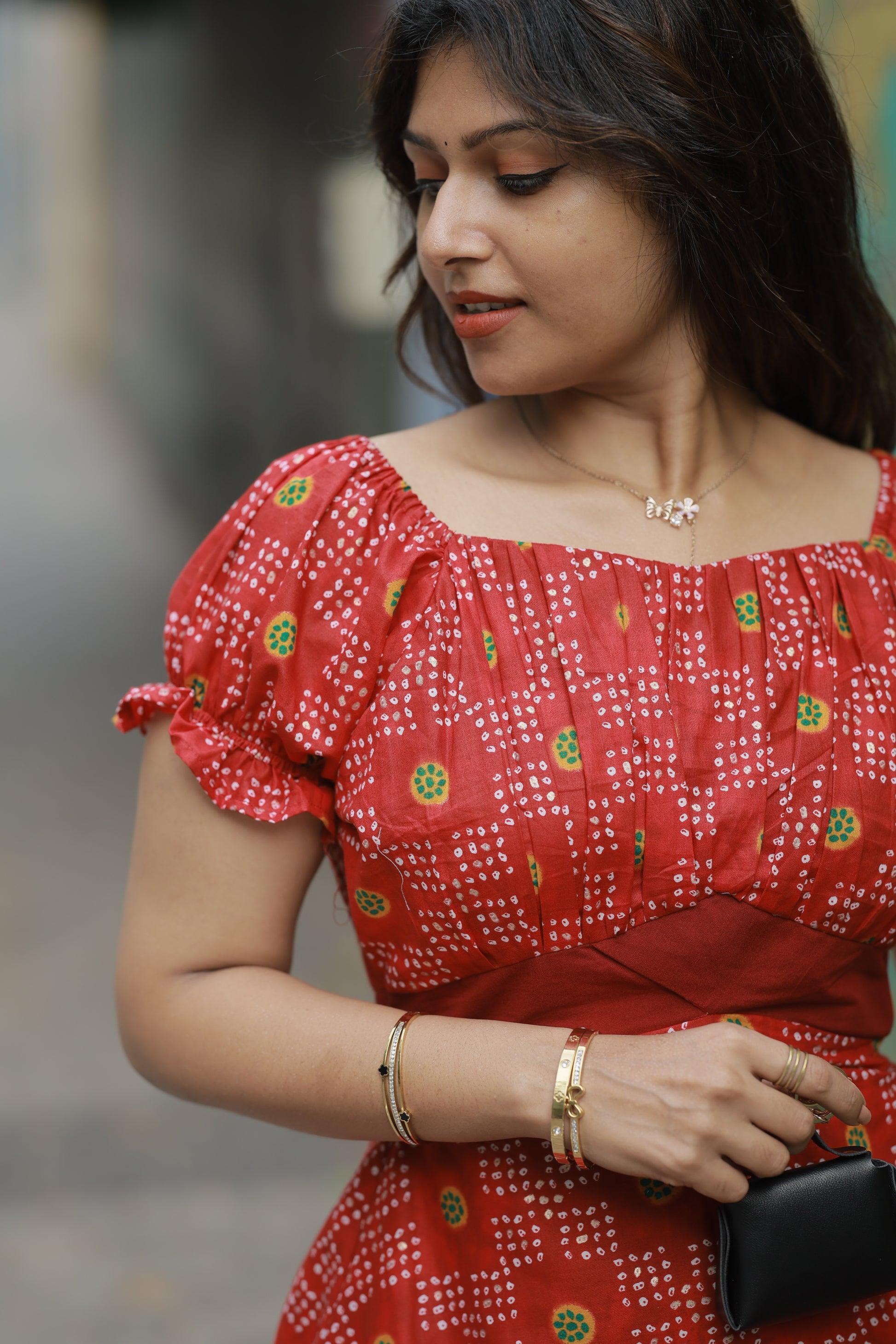 Vibrant red base adorned with white geometric circular patterns and olive green dots on yellow circle. The bold print is eye-catching without being overwhelming – perfect for making a statement.