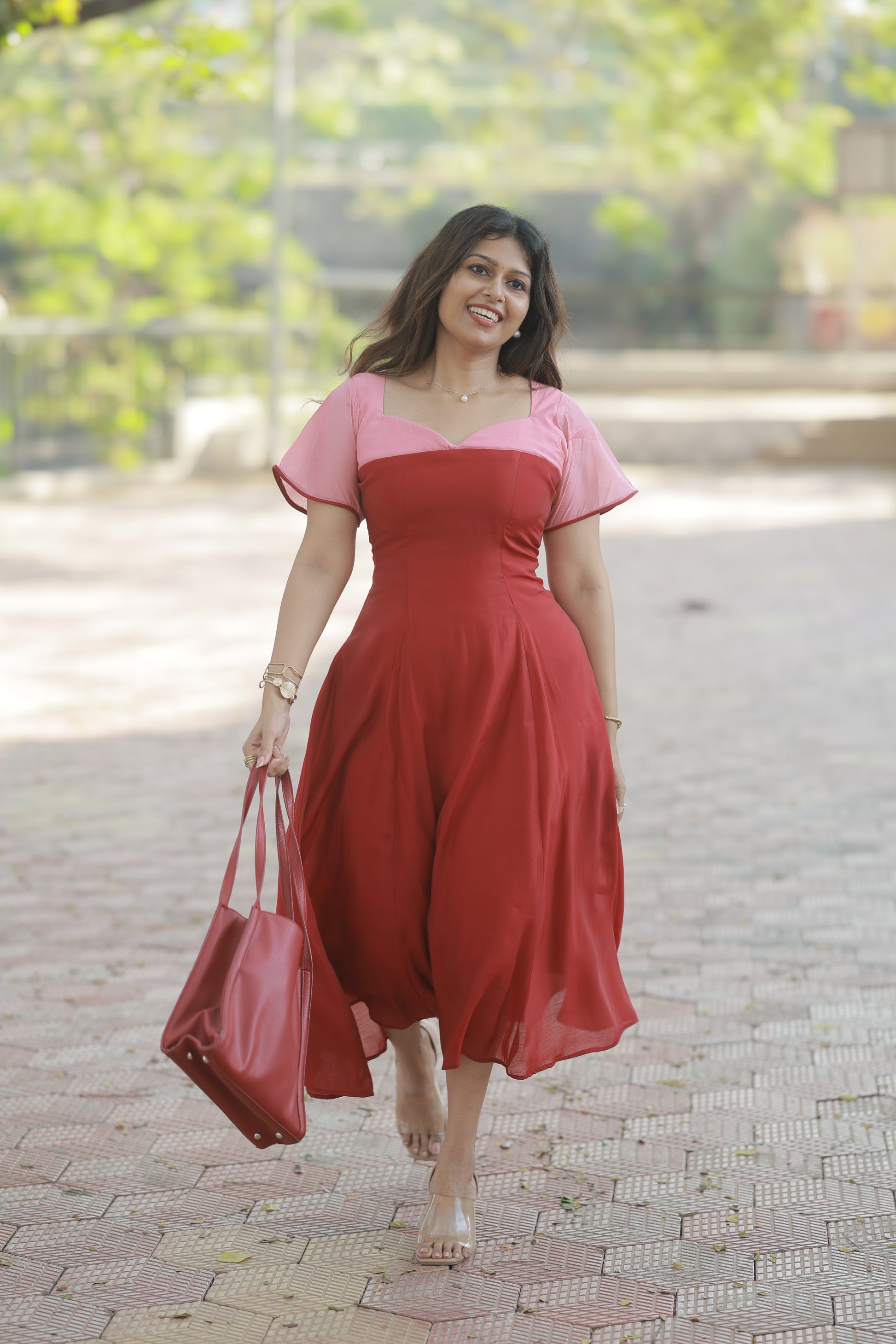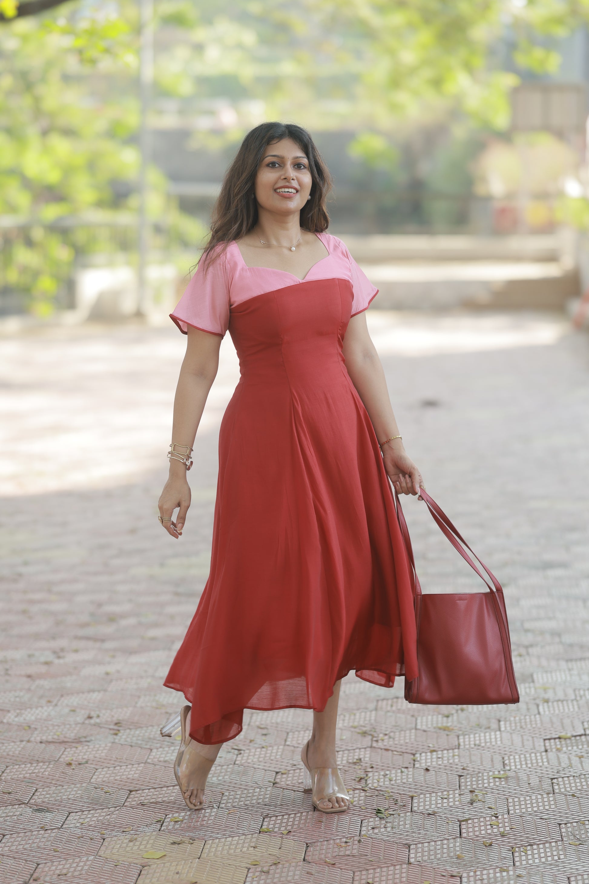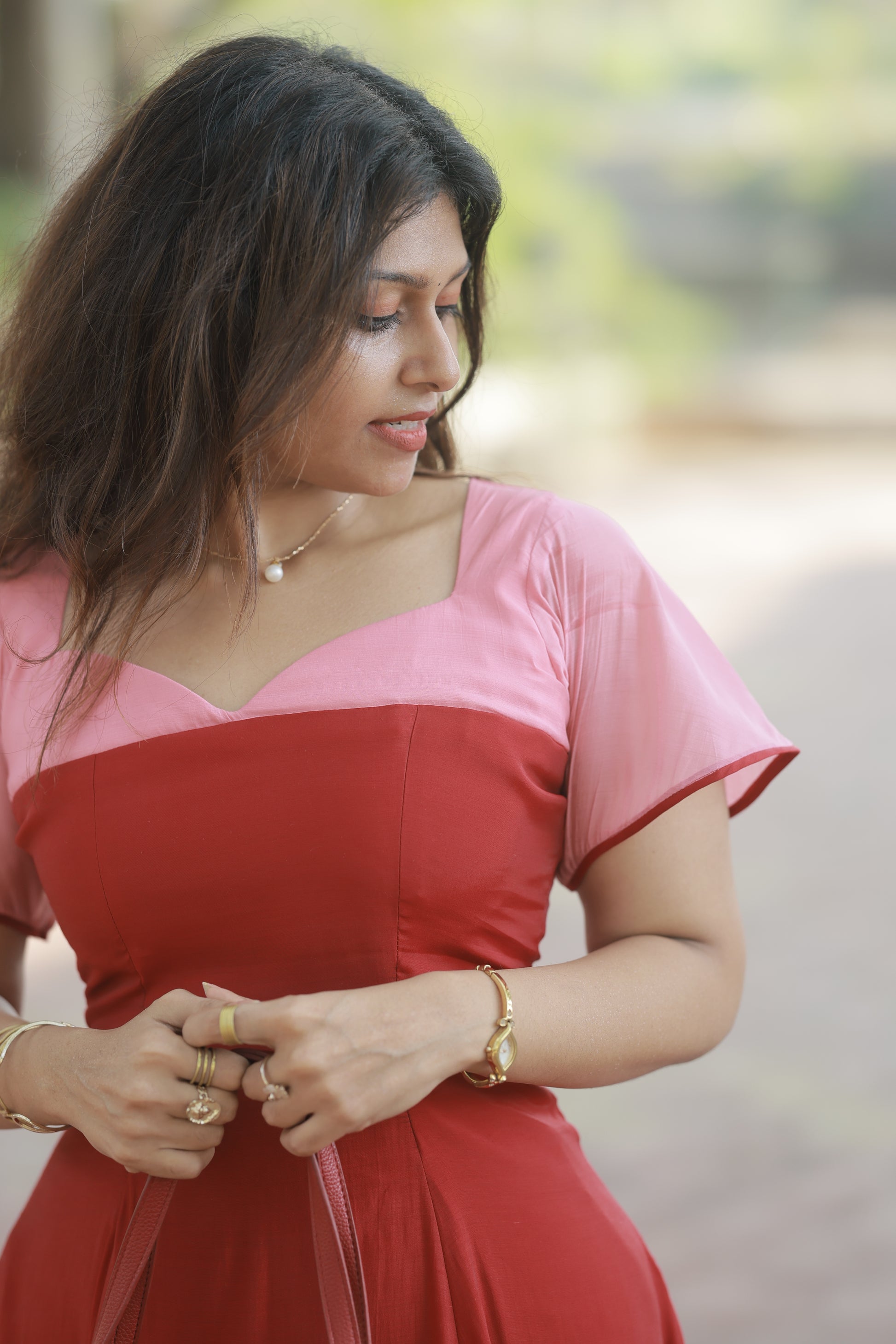 Crafted from luxurious Mul Chanderi fabric, this dreamy piece floats like poetry with every step. The rich red hue symbolizes passionate love, while the delicate pink contrast panels whisper sweet nothings – making this the perfect Valentine's ensemble for the modern romantic.