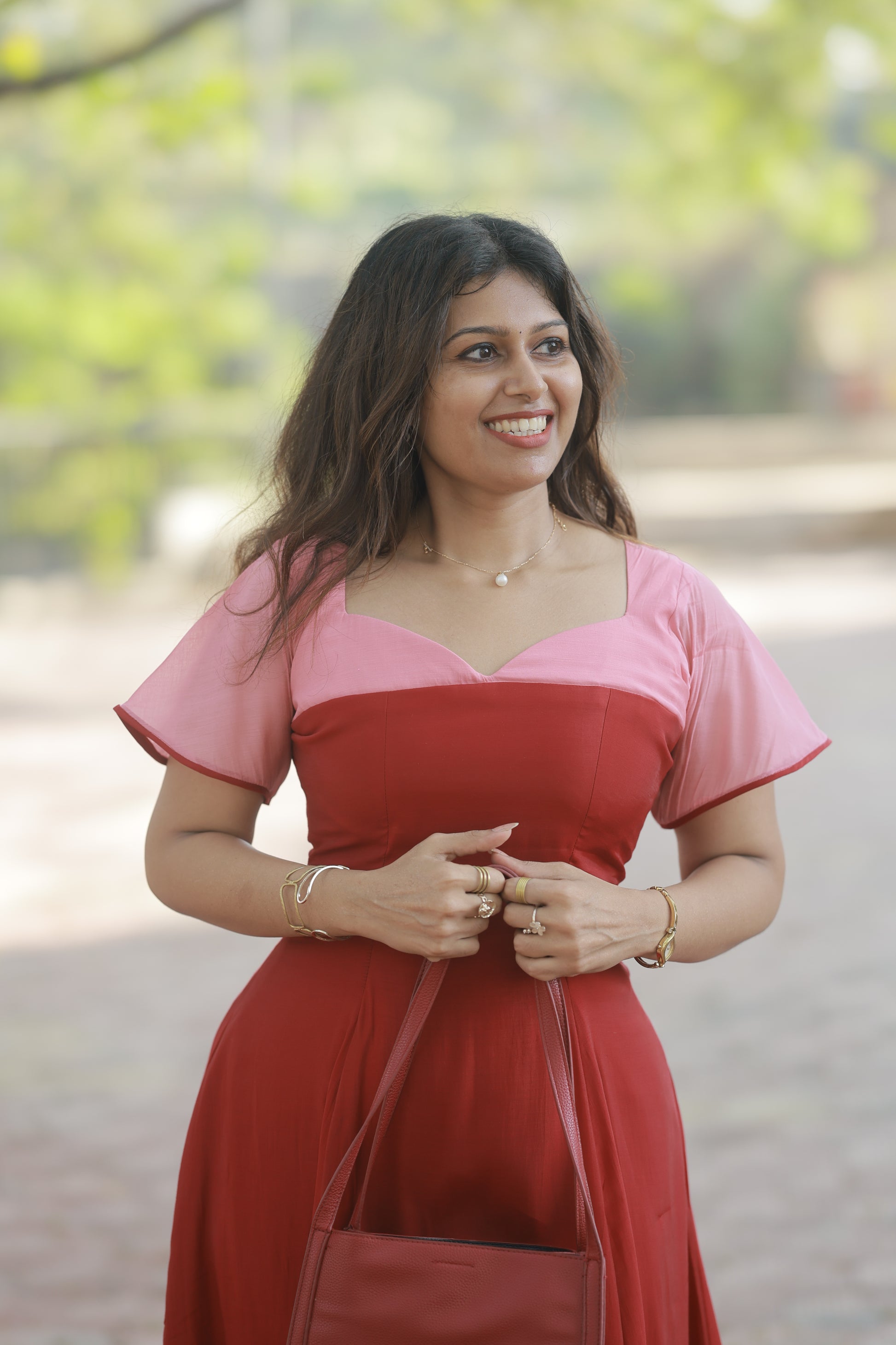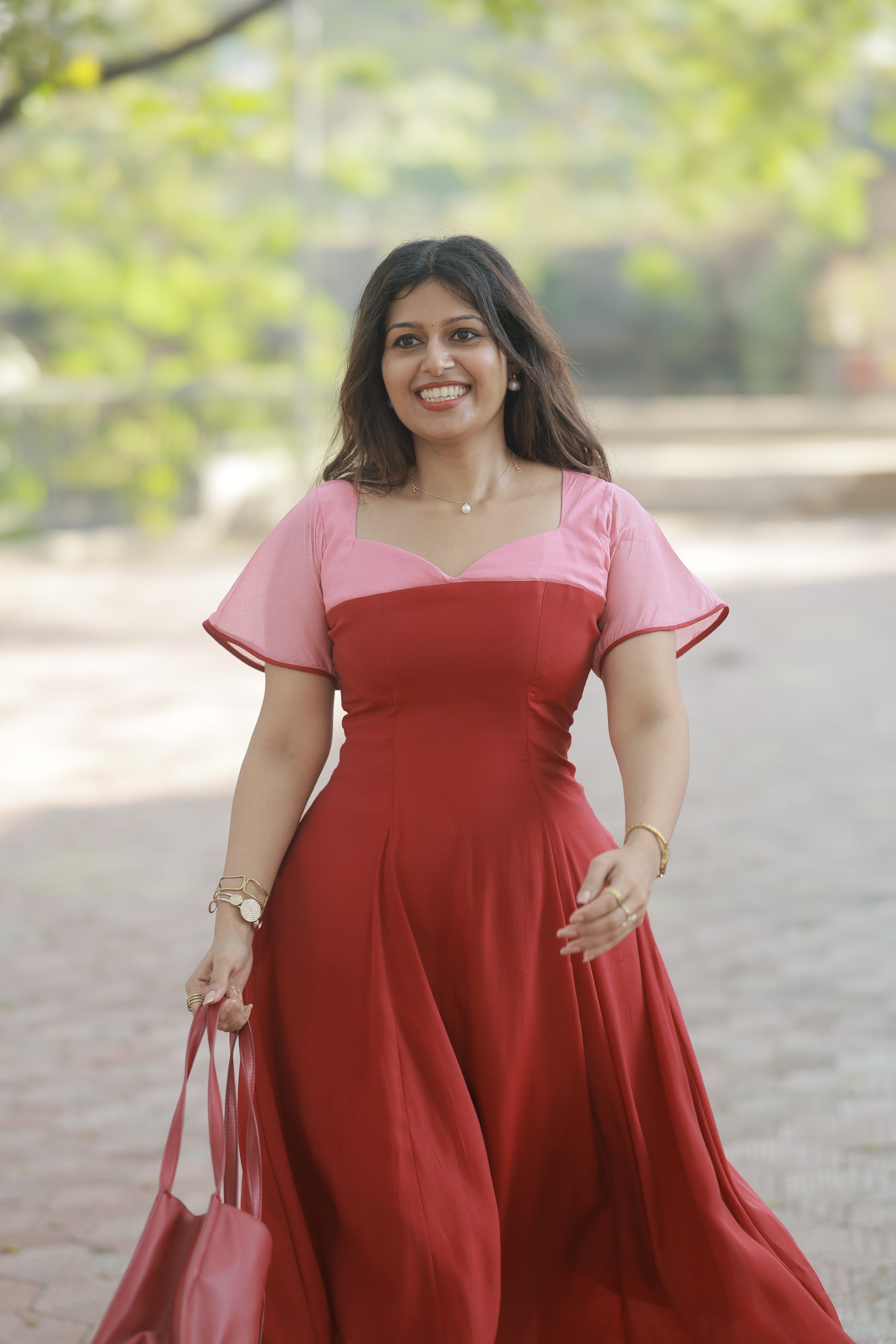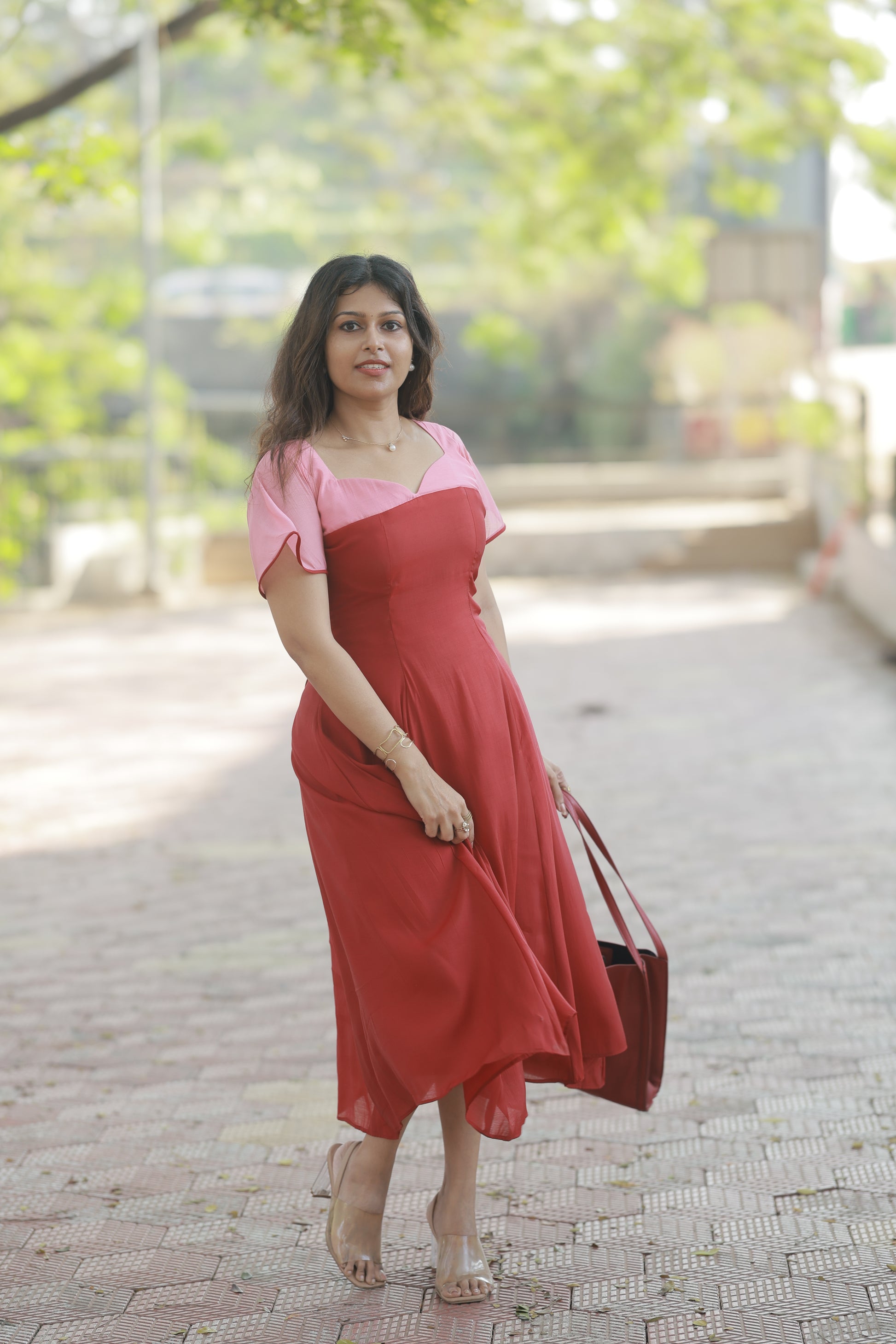 Crafted from luxurious Mul Chanderi fabric, this dreamy piece floats like poetry with every step. The rich red hue symbolizes passionate love, while the delicate pink contrast panels whisper sweet nothings – making this the perfect Valentine's ensemble for the modern romantic.