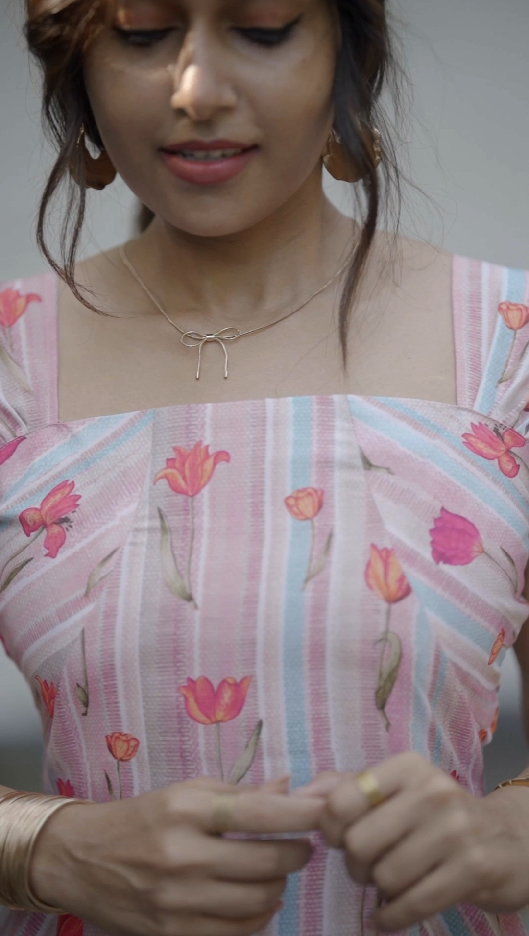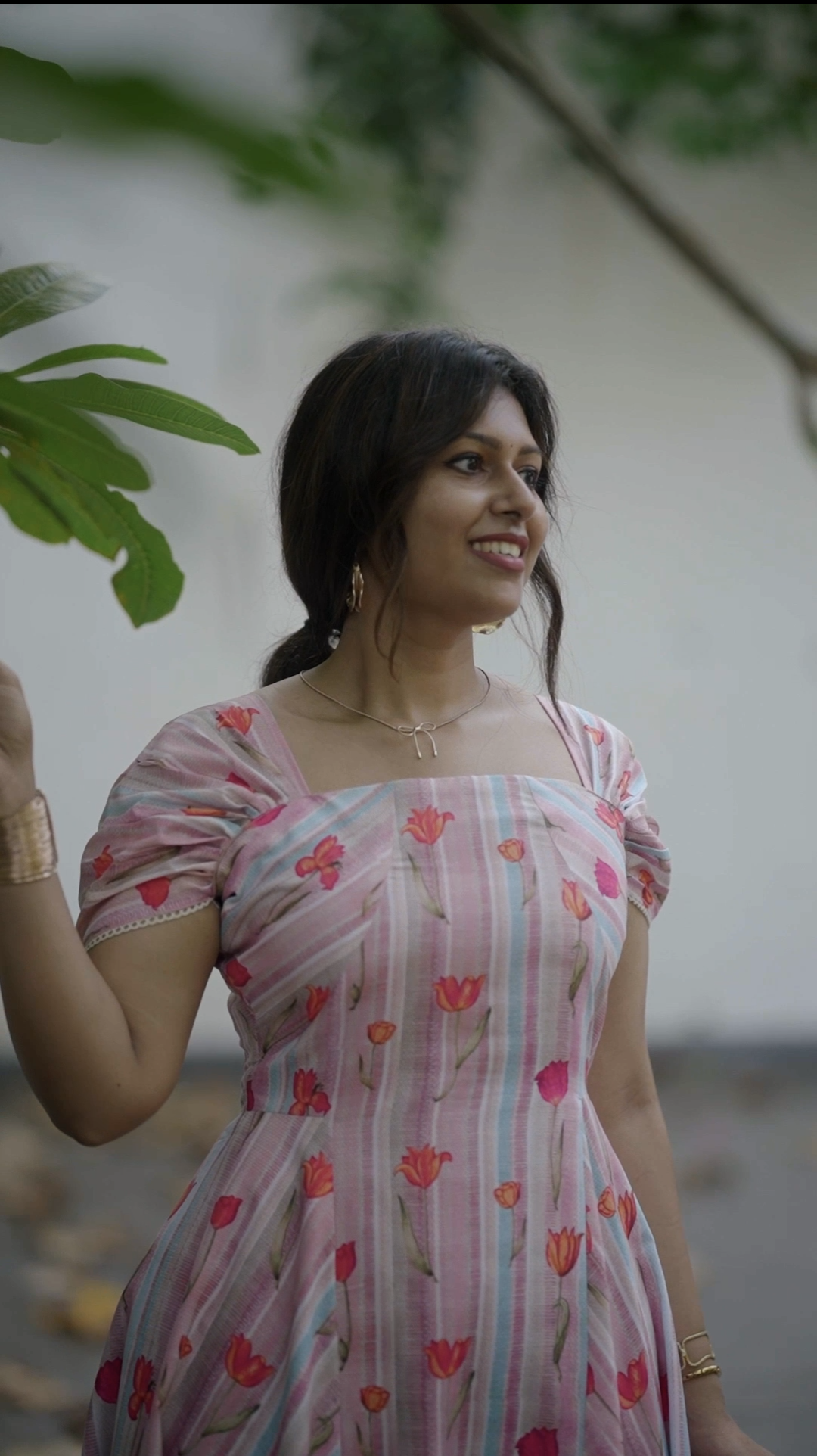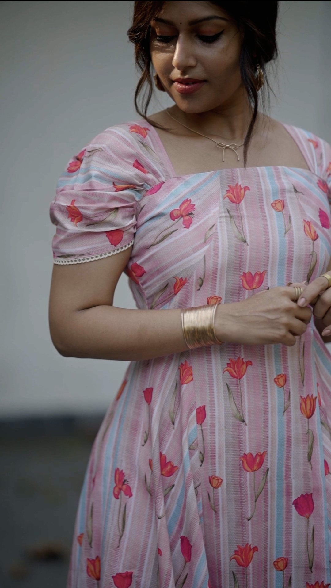 The Shishira midi dress is where romantic florals meet contemporary design. Crafted in premium rayon slub print fabric, this stunning A-line dress features a dreamy pink and blue striped base adorned with vibrant coral and red floral blooms that dance across the silhouette.