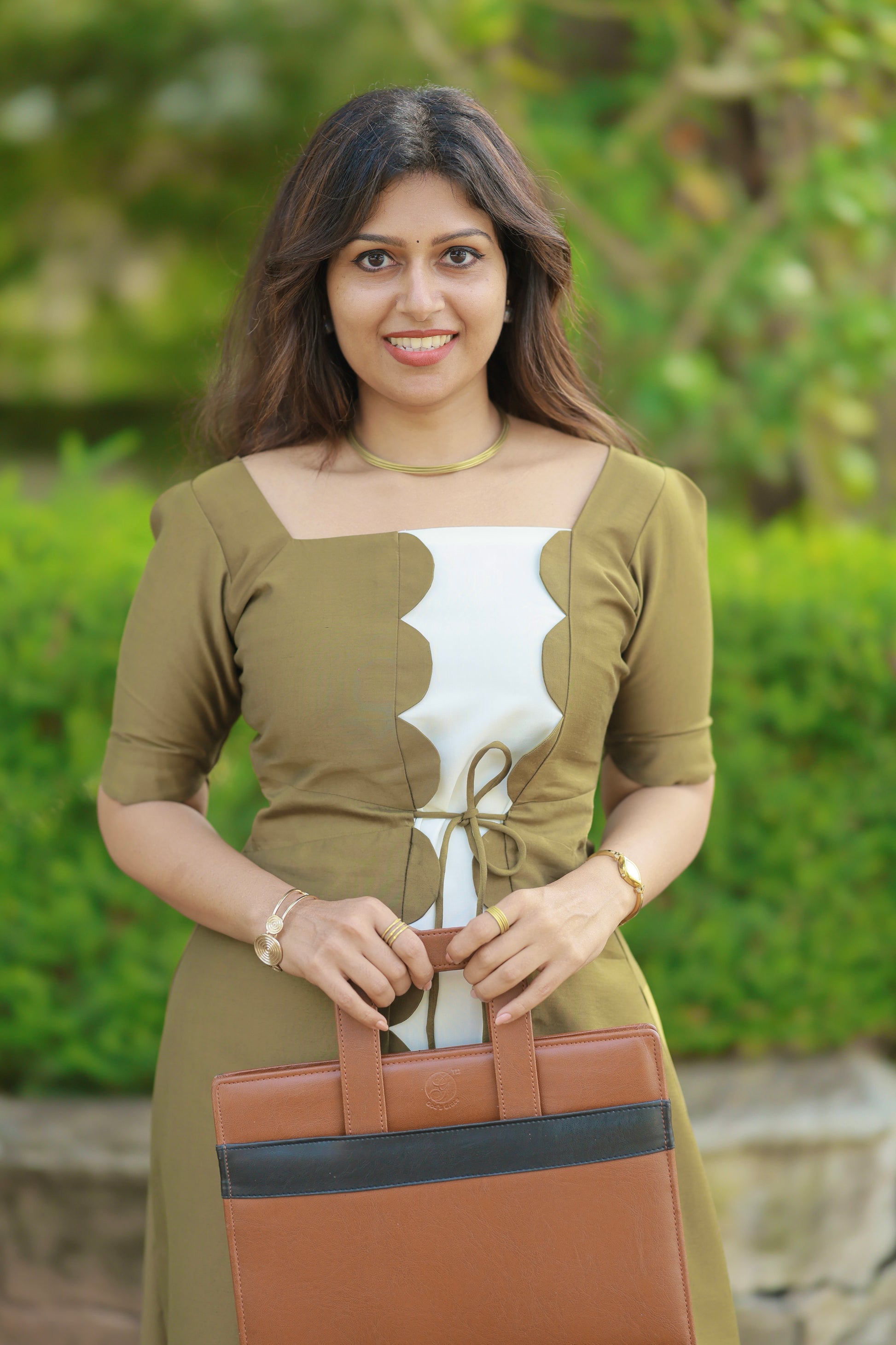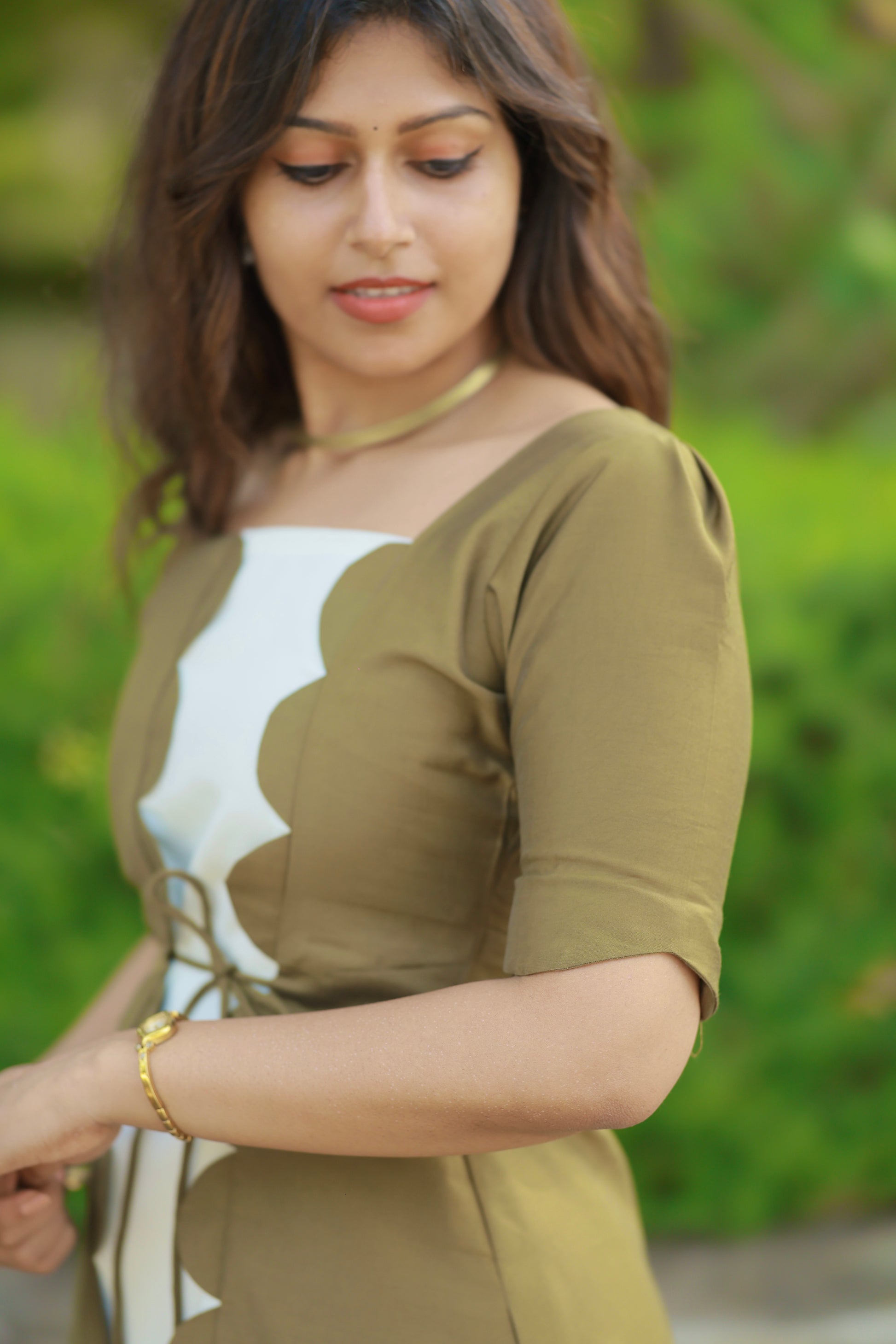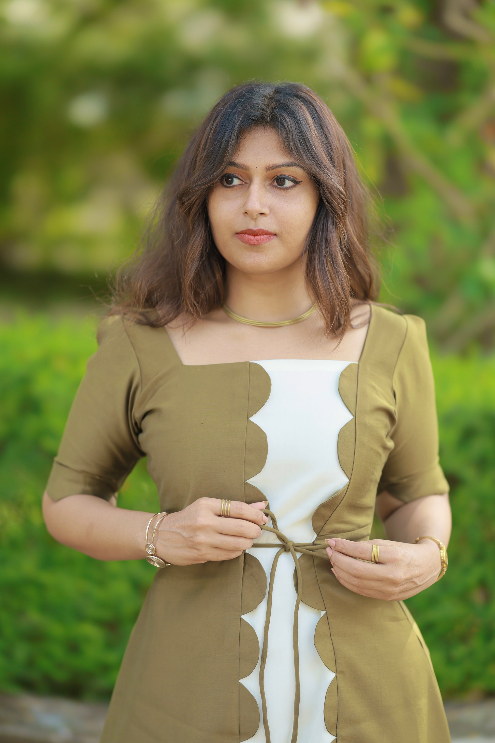 Introducing the Tropical Ivory – a sophisticated midi dress that showcases exquisite craftsmanship and timeless design. This stunning piece features a beautiful interplay of Olive-Green and ivory tones, creating a refined color-blocked aesthetic that's both modern and elegant.