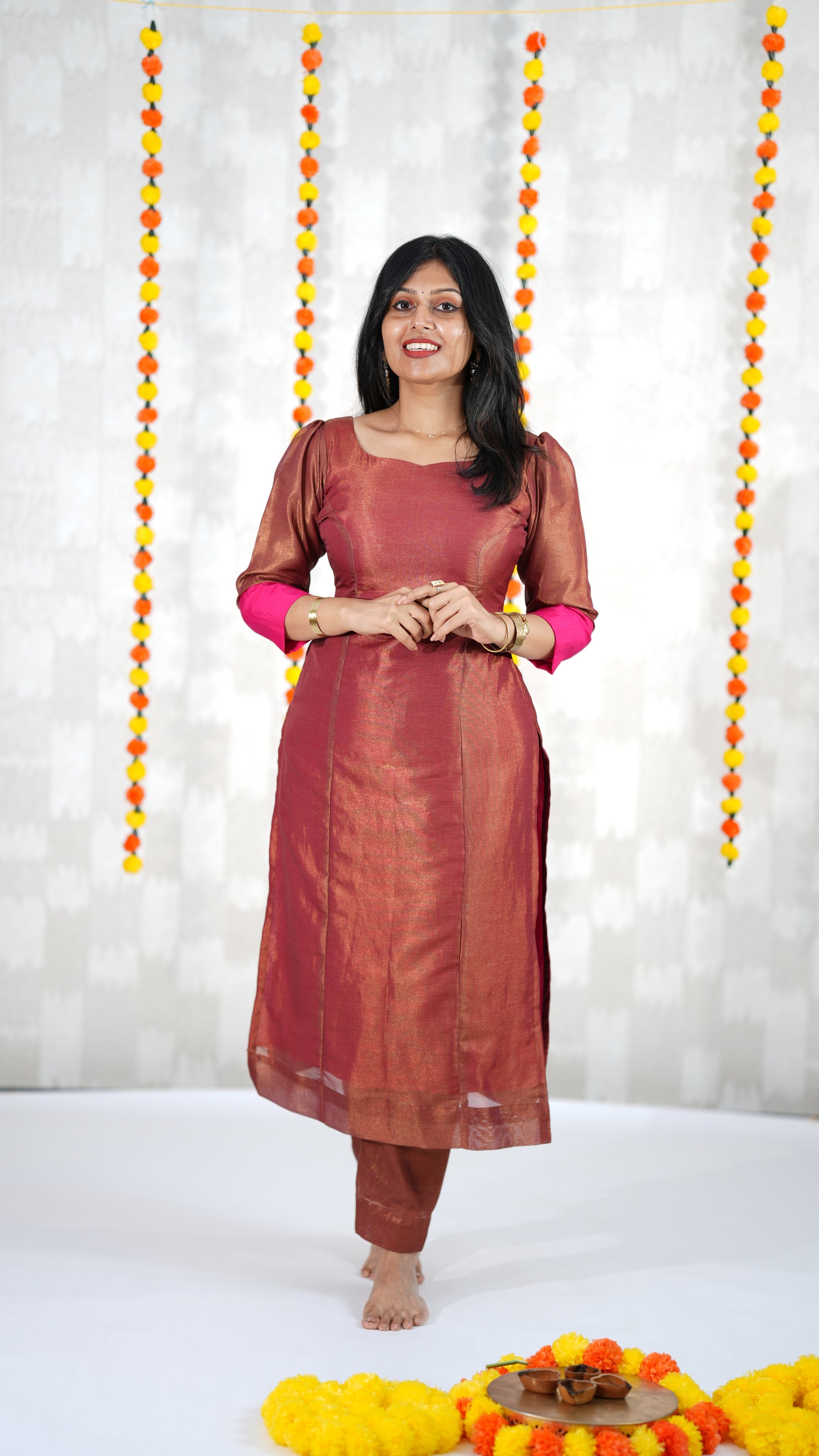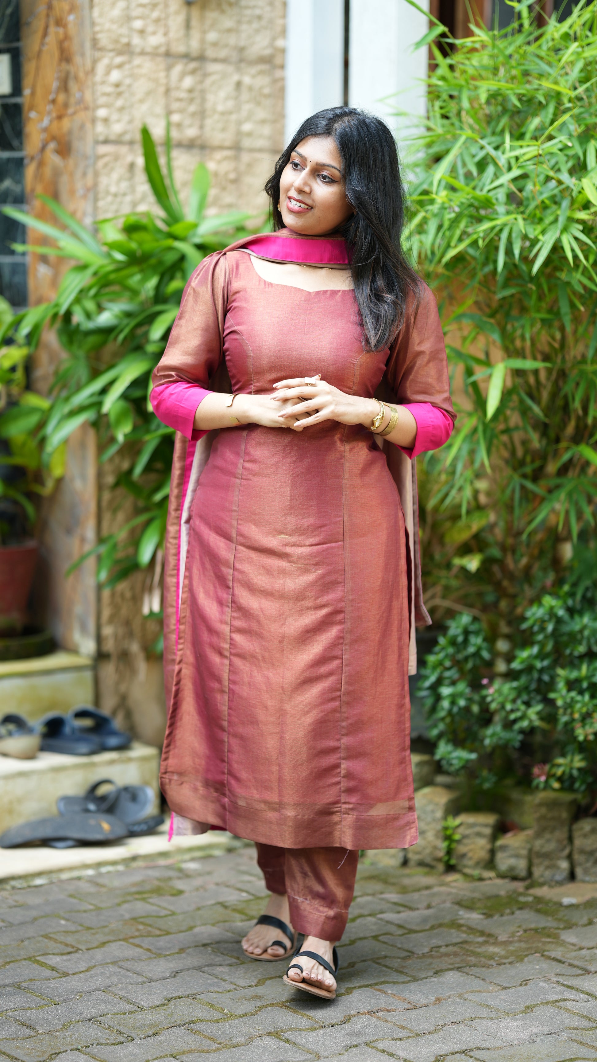 Step into effortless elegance with this chic maroon-pink silk kurta set ✨. Designed with a modern neckline cut-out and paired with a matching dupatta, this outfit blends classic charm with contemporary flair.